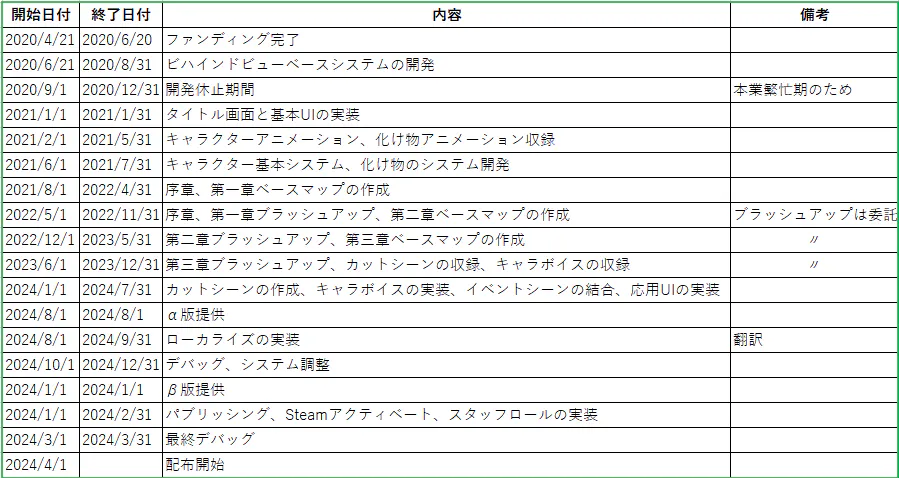 上記③に関連し、現在新型コロナウイルスの影響でモーションキャプチャースタジオが9月まで休業を発表しています。そのため、アニメーション作成の過程で開発に遅れが出ています。また、現在ゲームの全体的なクオリティアップを図っており、それによる開発の遅れも生じております。これらの要因から、当初予定しておりました2022年12月の提供開始を延期する必要がでてまいりました。下に新たなスケジュールを掲載します。