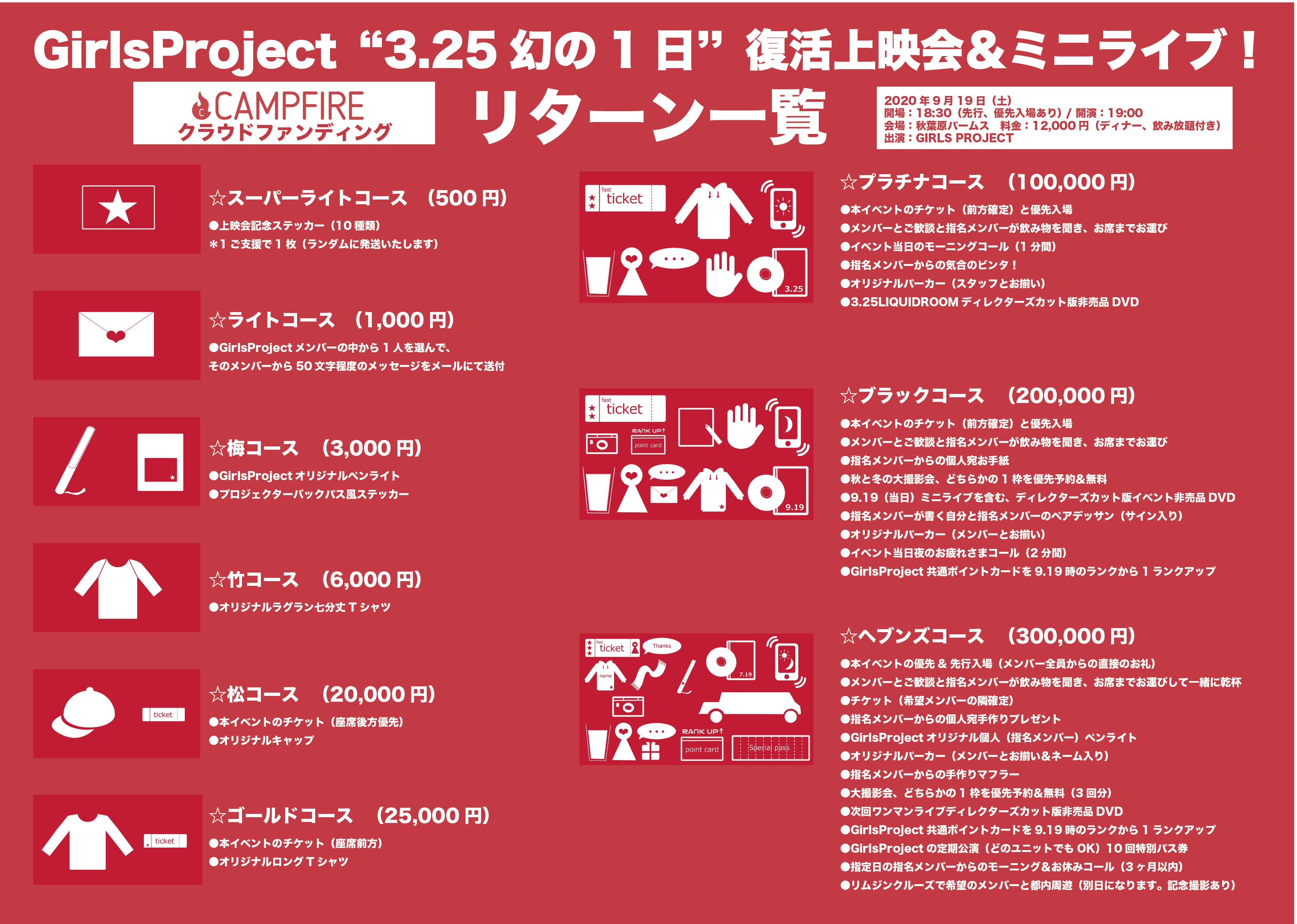 楽しみにしていただいていたファンの皆さまや、GirlsProjectを応援してくれる全ての皆さまと、クラウドファンディングという力をお借りし、まだ変わらず苦境に立たされているGirlsProjectと一緒にこの’’幻の1日’’を映像で蘇らせ、上映会という形で楽しいイベントを開催出来ればと思い、このプロジェクトを立ち上げました。