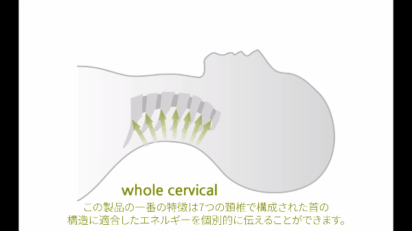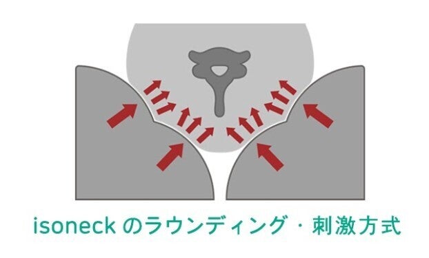 isoneck独自の形状(意匠登録済1605551号)のエネルギー分散ラウンディング刺激方式により物理的エネルギーが平均的に分散されます。これにより心地よい刺激へと変換されていきます。
