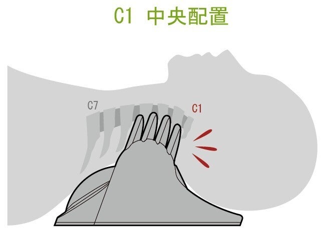 図のC1の真下に配置する事で首のコリを集中ケアします。首を伸ばしてコリをほぐしていきます。
