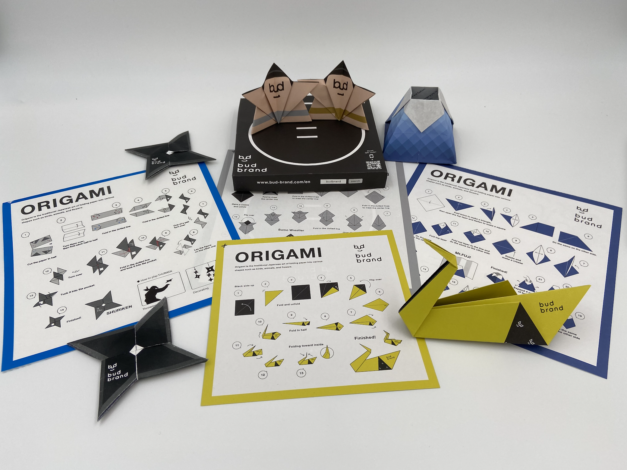 bud brandオリジナル折り紙です。折り紙は全部で4種類です。日本の文化をテーマに、とんとん相撲、富士山、鶴、手裏剣。説明書通り折っていけば素敵な折り紙が完成します。折り紙はランダムで2枚お送りします。