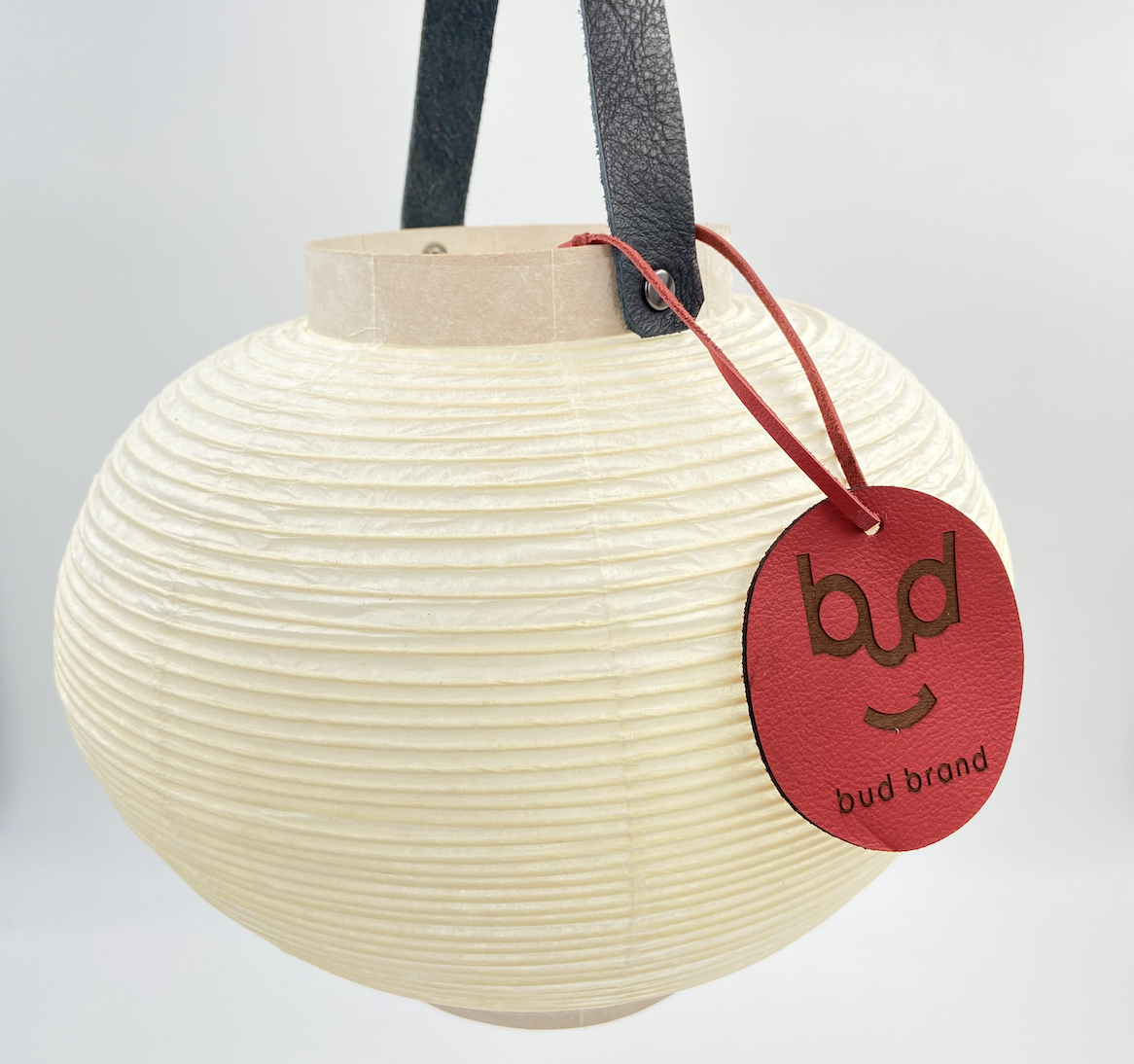 bud brandオリジナル提灯です。つるの部分はレザーをあしらい、吊るせるようになっています。bud brandのロゴをレザーに焼印をしたストラップ付きで可愛いインテリアとして飾ることも照明のランプシェードとしても使っていただけます。ランプシェードとしてご活用いただく場合は、提灯の底にはわっぱがひいてあるので、LEDのキャンドルライトなどを置けるようになっています。