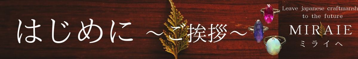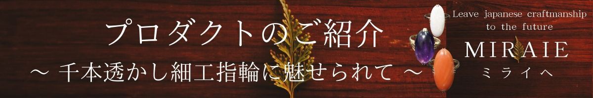 私たちは、日本の匠の技、日本の伝統技法を施した『 千本透かし金細工指輪 』を後世へ、そして未来へつなぐ活動をしている『 MIRAIE (ミライヘ)』と申します。