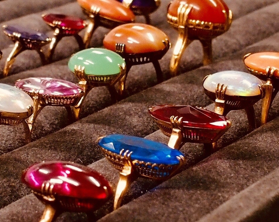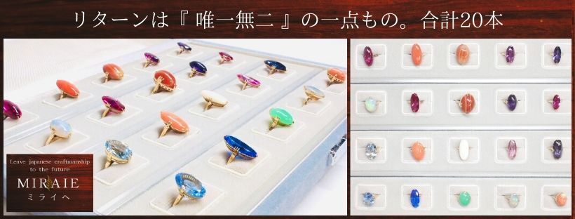 その技法で制作された指輪は、純国産宝飾品であるがゆえにダイヤモンド、エメラルド、ルビー、サファイヤなど海外製品で使われるような華やかな宝石が選ばれ取付けられることはほとんどありません。