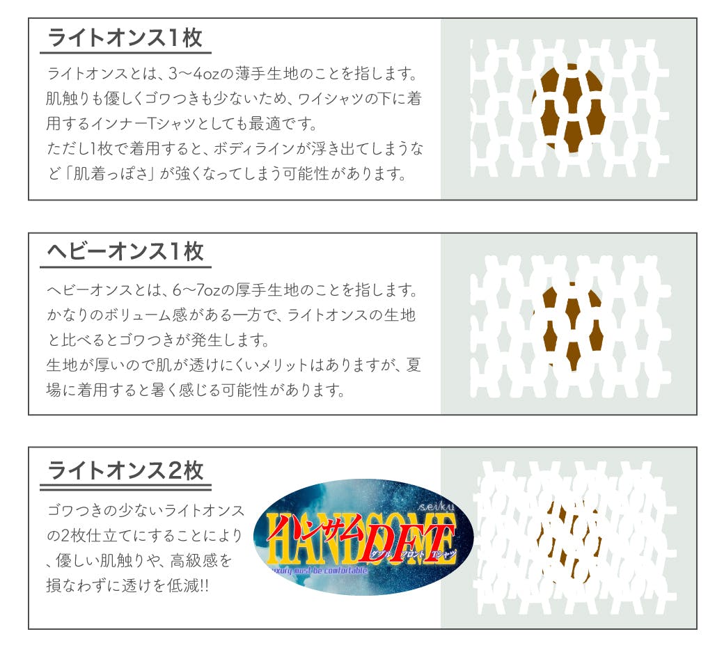 通常、生地の透け感を少なくするには太い糸(ヘビーオンス)で編まれた生地を使用します。あくまで糸が太くなるだけなので、糸の隙間は出来ます。また伸縮性が弱くなるのでダボッとしたシルエットになりがちです。
