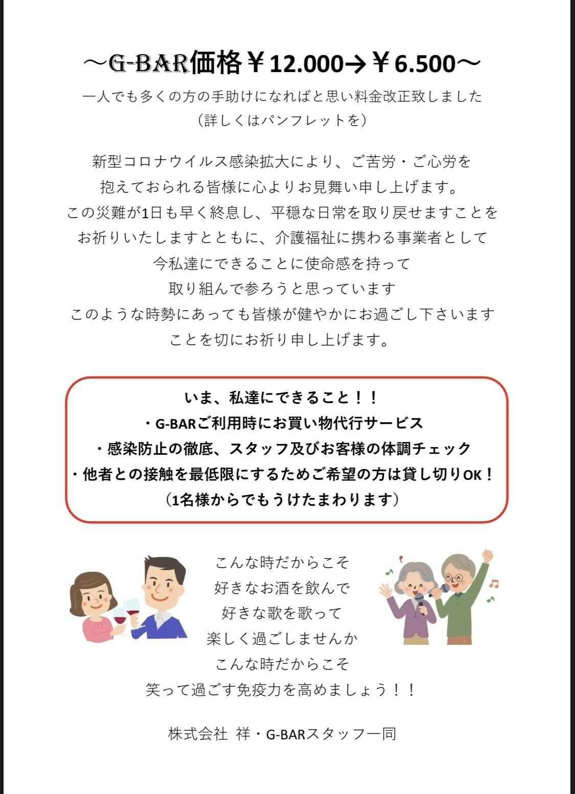 初めまして。介護・送迎付き【G-BAR】の店長 鰐口です。