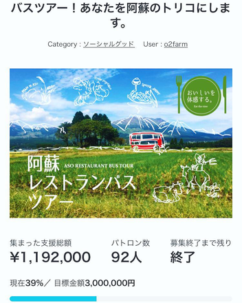 2017/05/18 09:23《クラウドファンディング終了のお知らせ》 2017.4.3よりスタートしたクラウドファンディング、『阿蘇の農家がプロデュースするレストランバスツアー!あなたを阿蘇のトリコにします。』は、昨日2017.5.17 23:59を持って終了いたしました。https://camp-fire.jp/projects/view/26090 みなさまからのご支援いただいた総額は、¥1,192,000という結果となりました!! 全国から92名もの方々より、あたたかいご支援をいただき、本当に感謝の気持ちでいっぱいです!! 目標達成には至りませんでしたが、それ以上にみなさまからの応援がわたしたち農家の背中を力強く押してくれて、そして励みとなっております!! 集まった支援金は、「この風景を守りたい」という根底にある想いからはじまった『レストランバスツアー熊本』の活動資金へとあてさせていただきます。 そして、みなさまにお選びいただいたリターンにもおひとりおひとりに心を込めてお返しができたらと思っておりますので、しばしお待ちください。 あたたかく心強いご支援、みなさま本当にありがとうございました!今後とも応援をよろしくお願い致します。 大津愛梨 もっと見る
