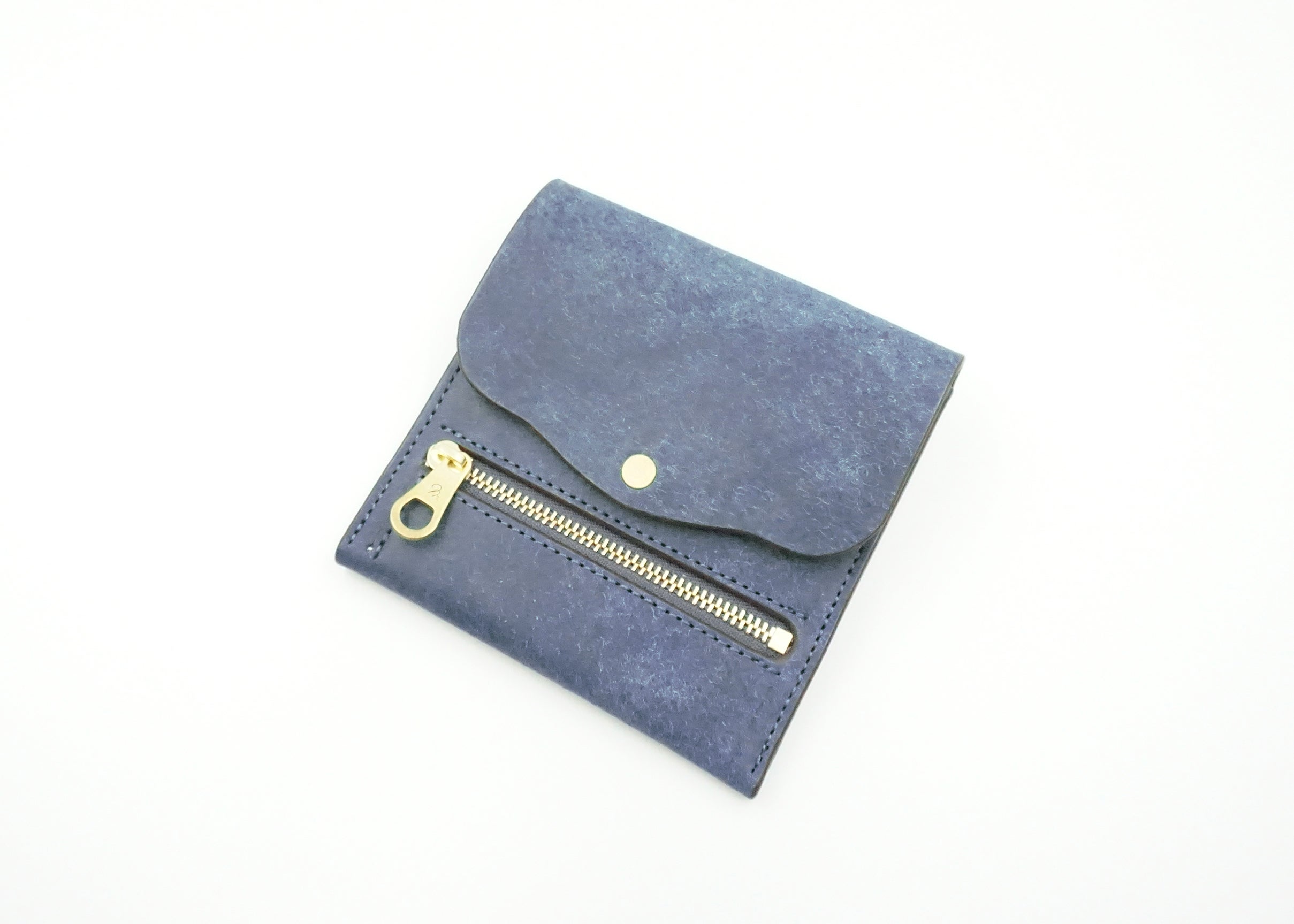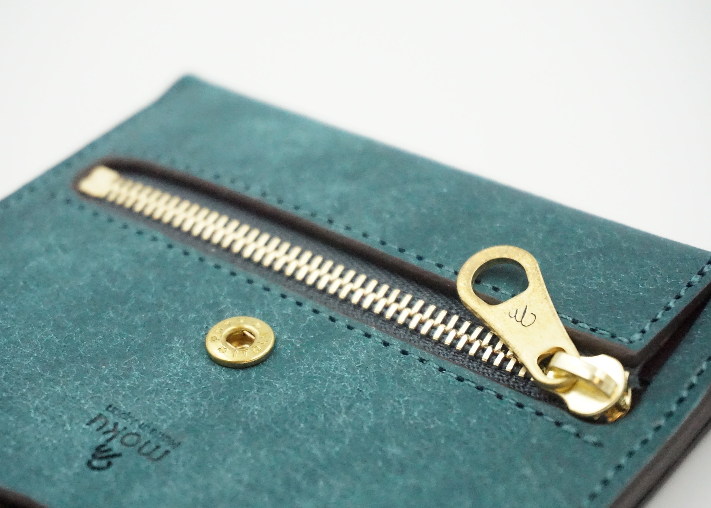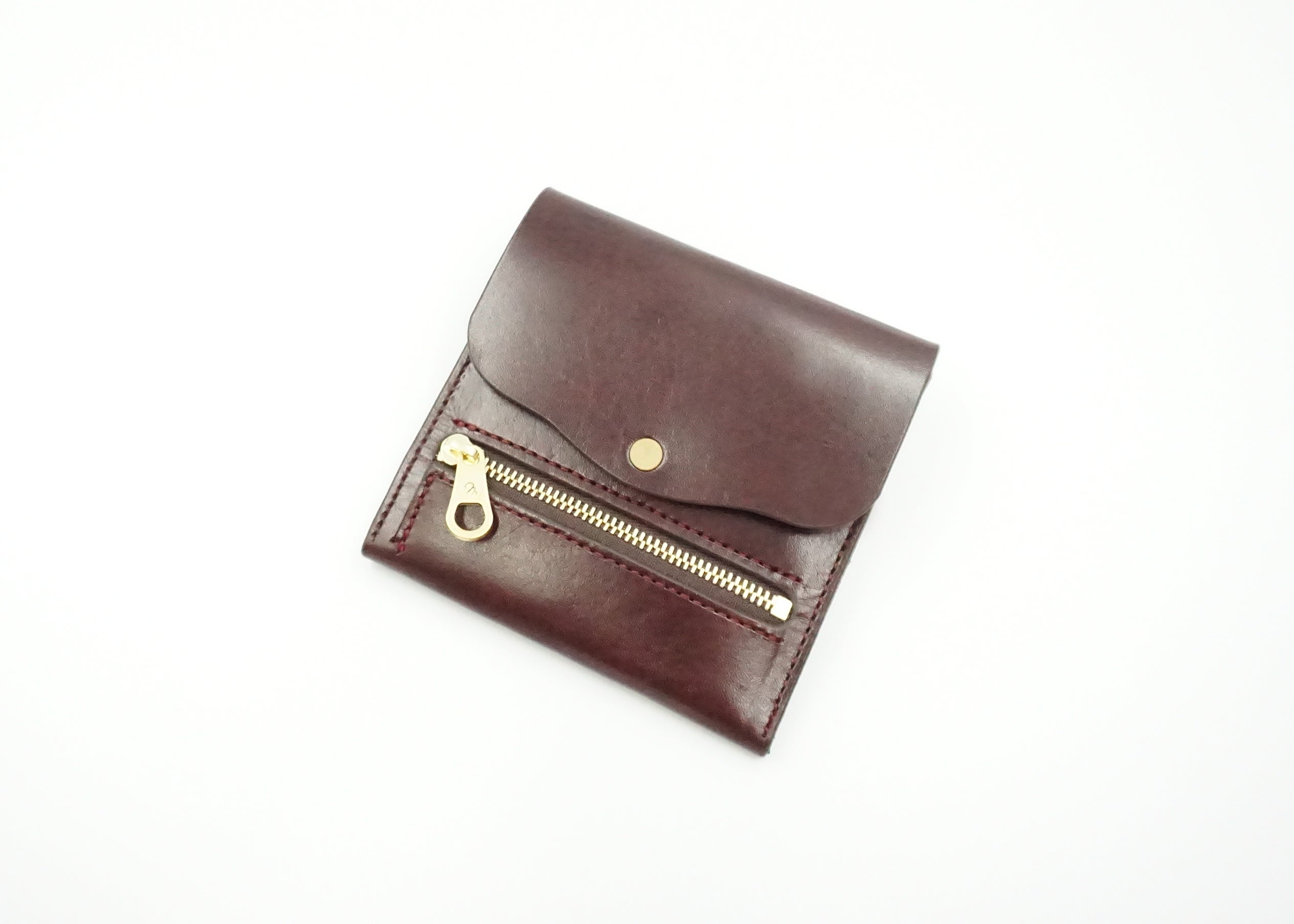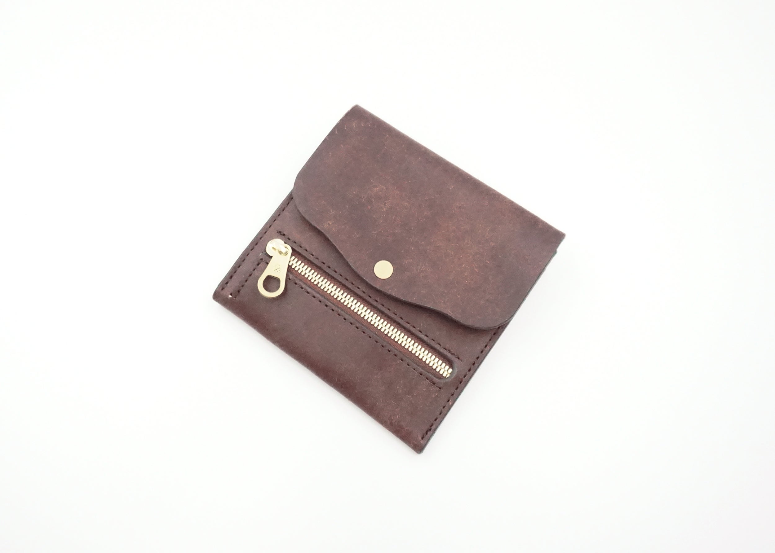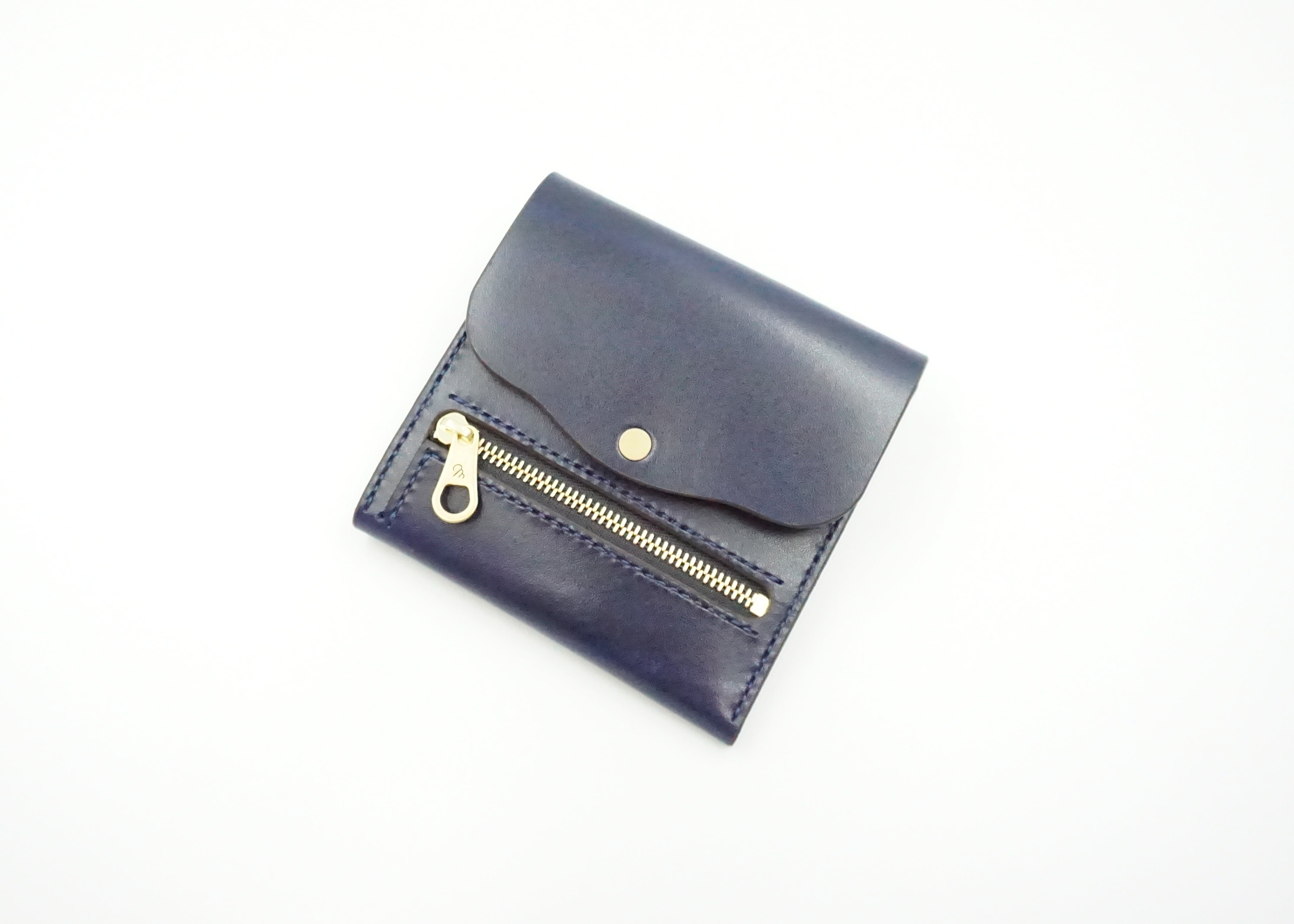 一枚革を三つ折りにして、コインケース及びカードケースを形成するために必要な最低限の縫製を行うことによって、紙幣・カード・コインを収納可能にする画期的なデザインに対して、意匠権を出願済みです。