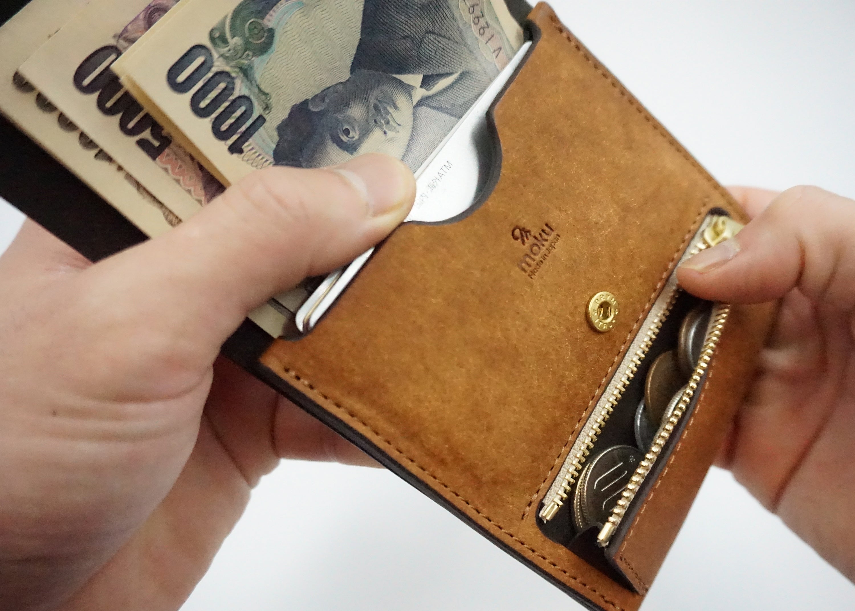 これは当たり前のように感じますが、ICHIとコンセプトが似た薄い財布を特徴にした製品の中には、お札と小銭が別々の方向から取り出す構造になっているケースもあります。