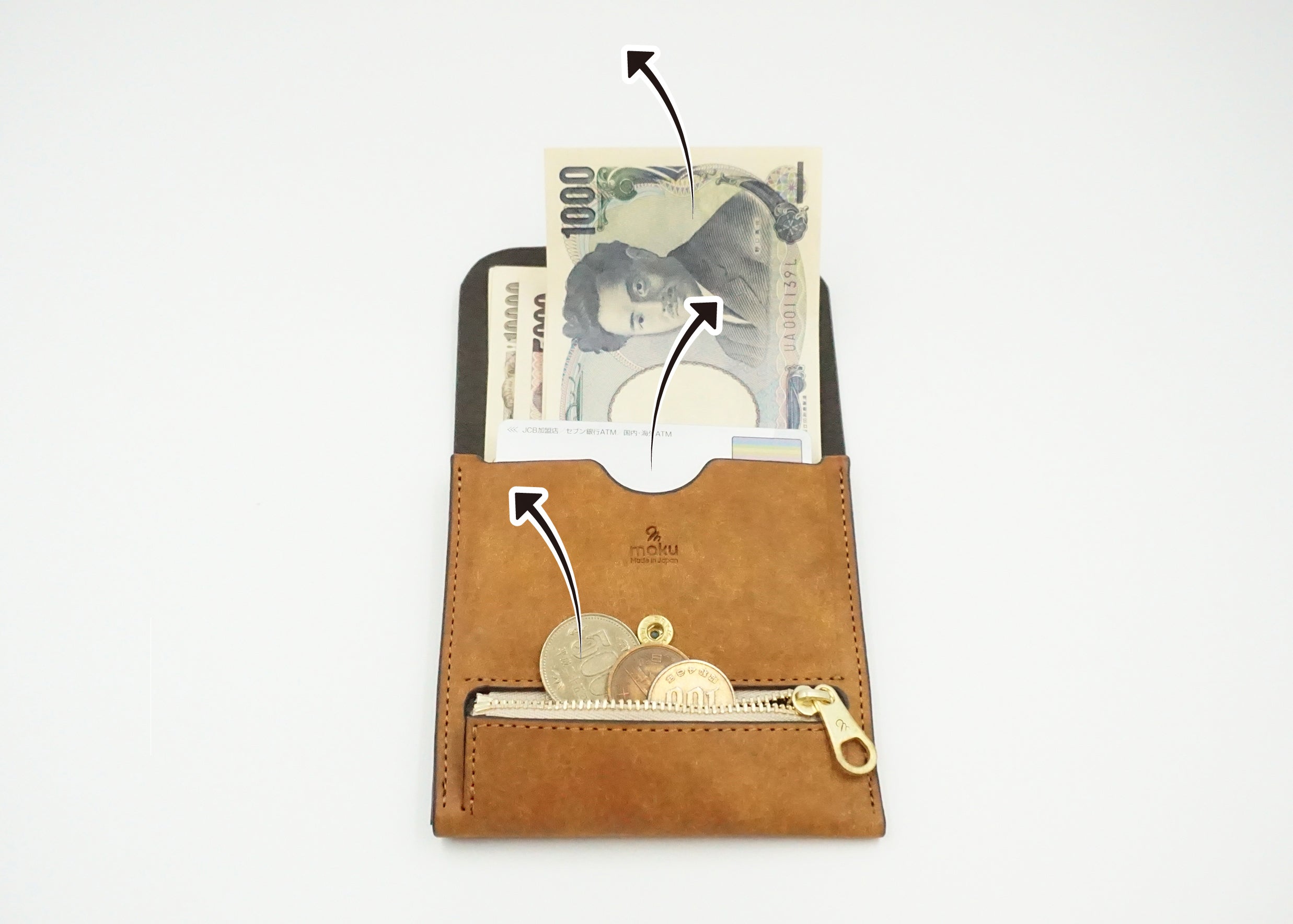 正面から見て左側は3枚の革のうち2枚だけが縫われていて、お札が入るポケットはオープンになっているため、コインやカードがたくさん入ってもお札の出し入れがスムーズに可能です。