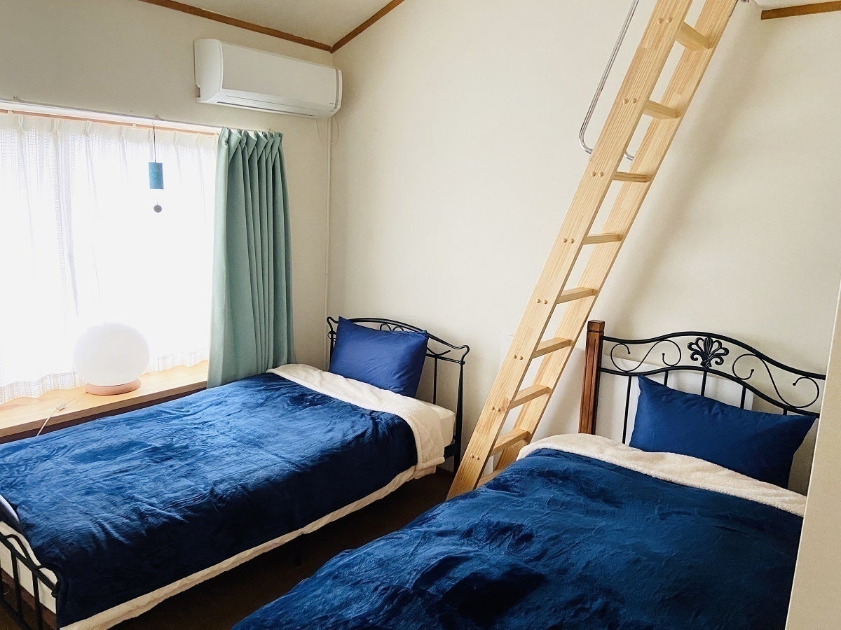 Room1はアイアンフレームベッドでお迎えいたします。階段の先にはロフトがあります。