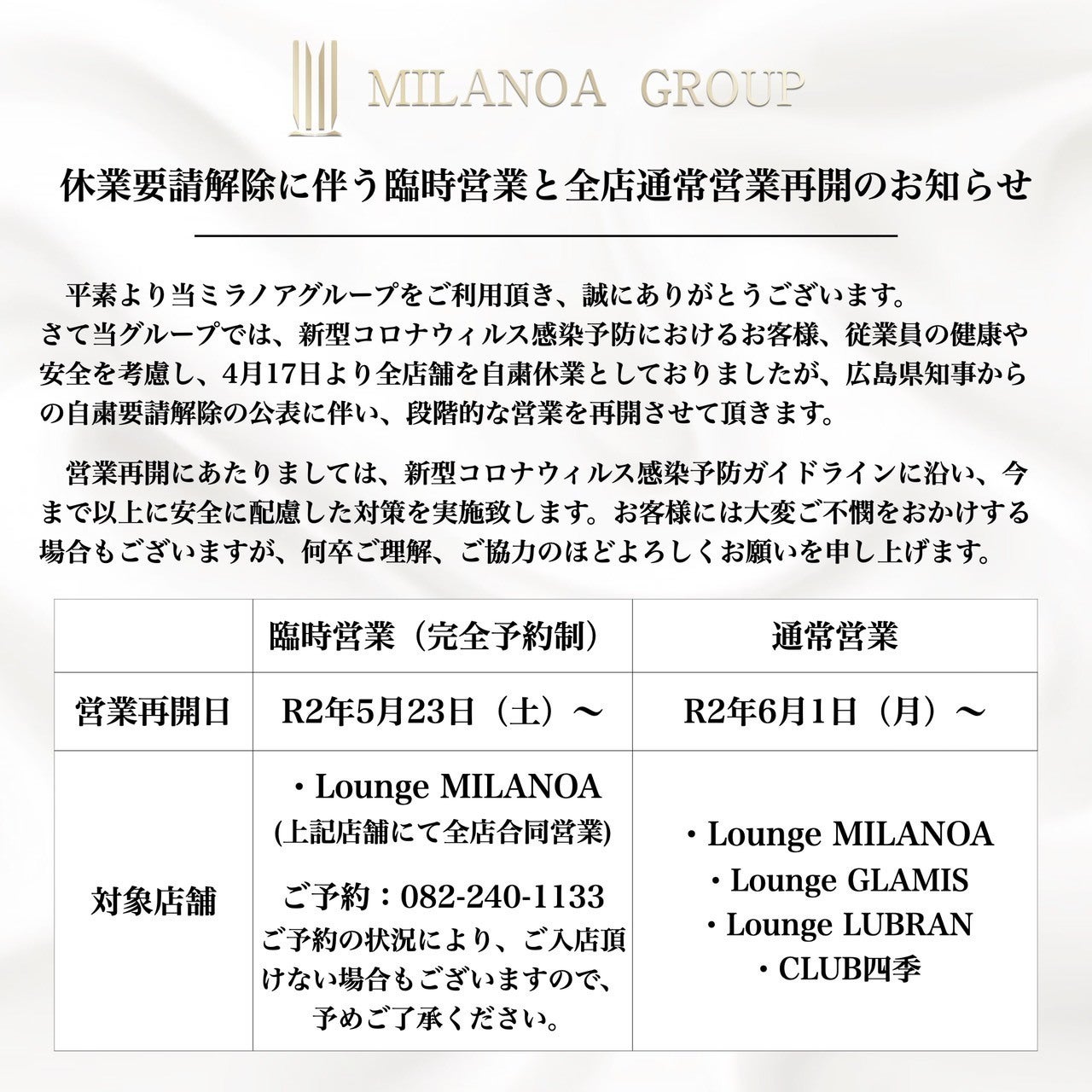 私たちは、人と人の繋がりを大切に、流川から繁華街の活性化、繁華街から広島の街の活性化を目的として、総勢200名を超えるキャストさんやスタッフさんと、日頃よりご愛顧くださるお客様はもちろん、お仕事や観光、旅行など様々な理由で広島にいらっしゃったお客様などを多数お迎えしてまいりましたが、この度のこの新型コロナウイルス感染拡大に対し、自分達も出来る事で感染防止に全面協力をしようと、グループ全店舗営業自粛による臨時休業を決断致しました。
