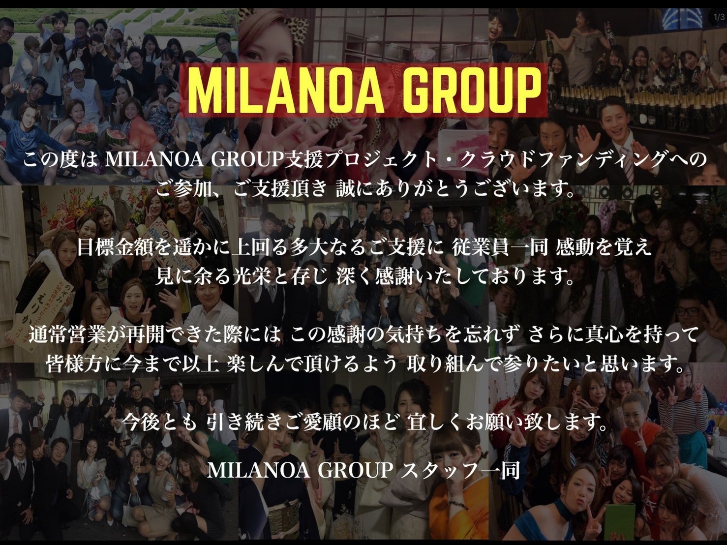 地元である広島はもちろん、県外からも日頃ミラノアグループ各店を応援して下さるみなさま、そして、今回このプロジェクトにより巡り会えましたみなさまへ