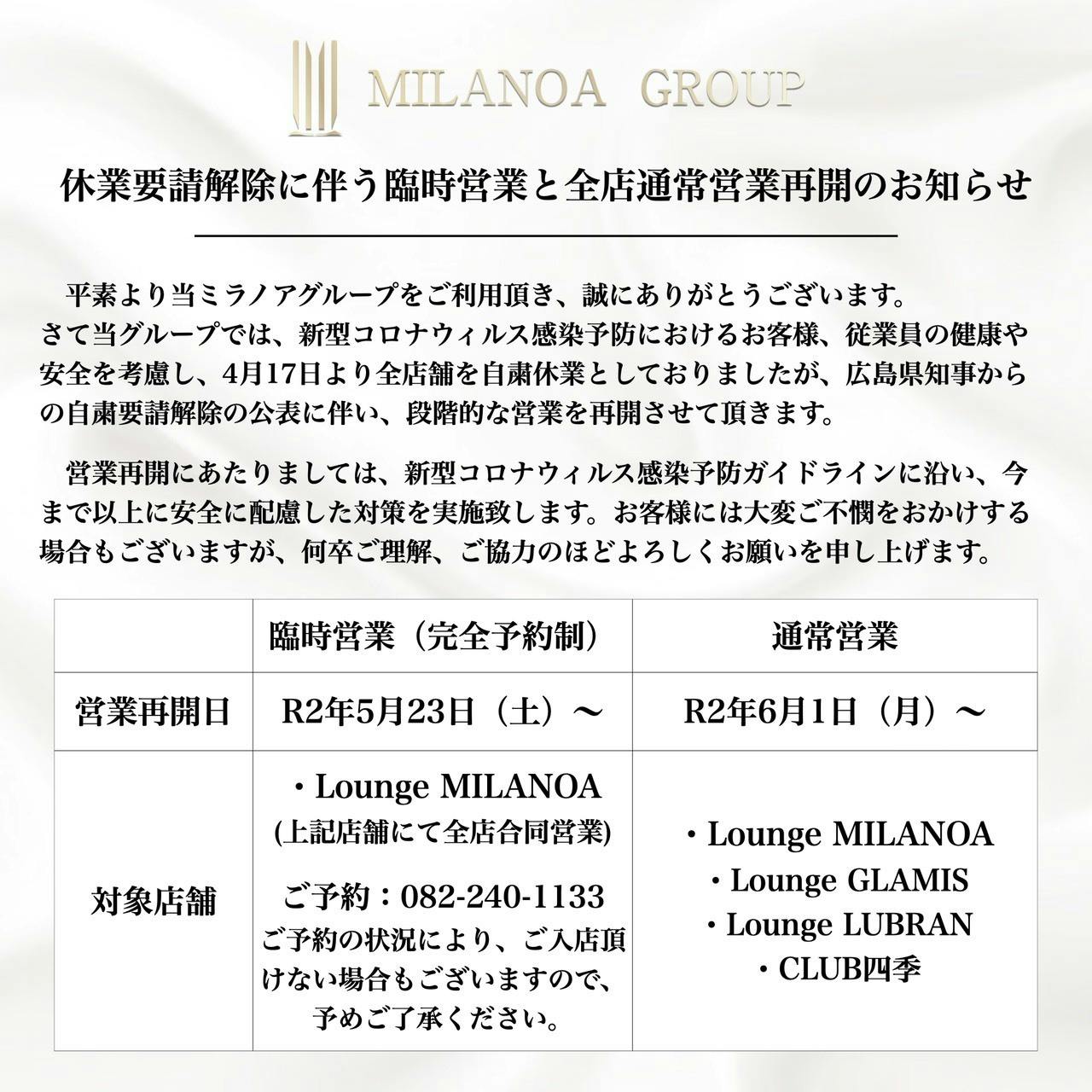 2020/05/23 11:17昨日の夕方、急遽広島県の休業要請と外出自粛が全面解除されました!!!よって、通常営業再開は予定通り6月1日からと致しますが、全面解除に伴う臨時措置として、本日よりミラノアにて予約営業をさせて頂きます!全店本営業開始は6月1日からとなりますので、何卒宜しくお願い致します!! もっと見るご報告