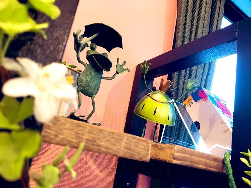 店長のカエル好きがロゴにも反映され、店内にはたくさんのカエルの置物が飾られており、店名とマッチした世界観となっております。