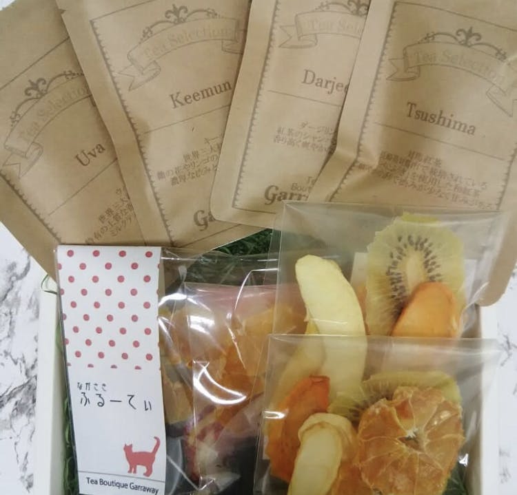 ふるーてぃとは、ドライフルーツと紅茶のTパック1包が入っております。