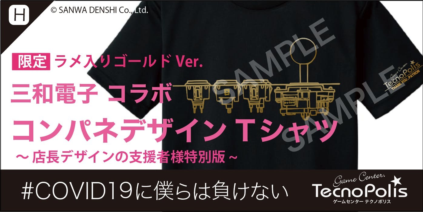 ②の内容(+店内壁面掲示)+コンパネデザイン特製Tシャツ(三和電子コラボ/ゴールド色プリント)を発送にてお届けさせていただきます。このカラーは高コスト製造なので今回限り限定品です。