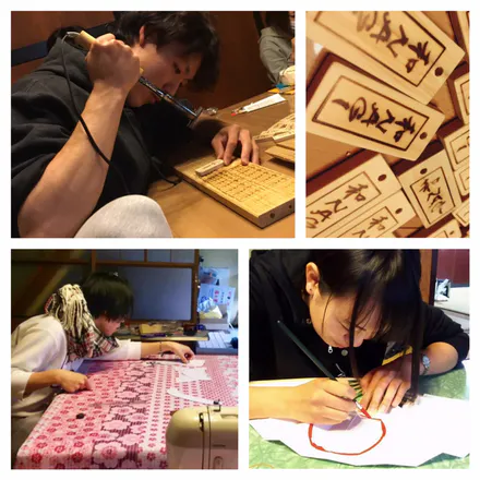 一時間目から授業があった人も、遅くまで授業があった人も協力して作業を進めました。衣装班は型紙を取って布を切って縫い合わせ、道具班は扇に日の丸を描いたり千社札用の木をやすりで磨いたり焼き印を押したり…お稽古合宿とは一味違った達成感を得られることができました。