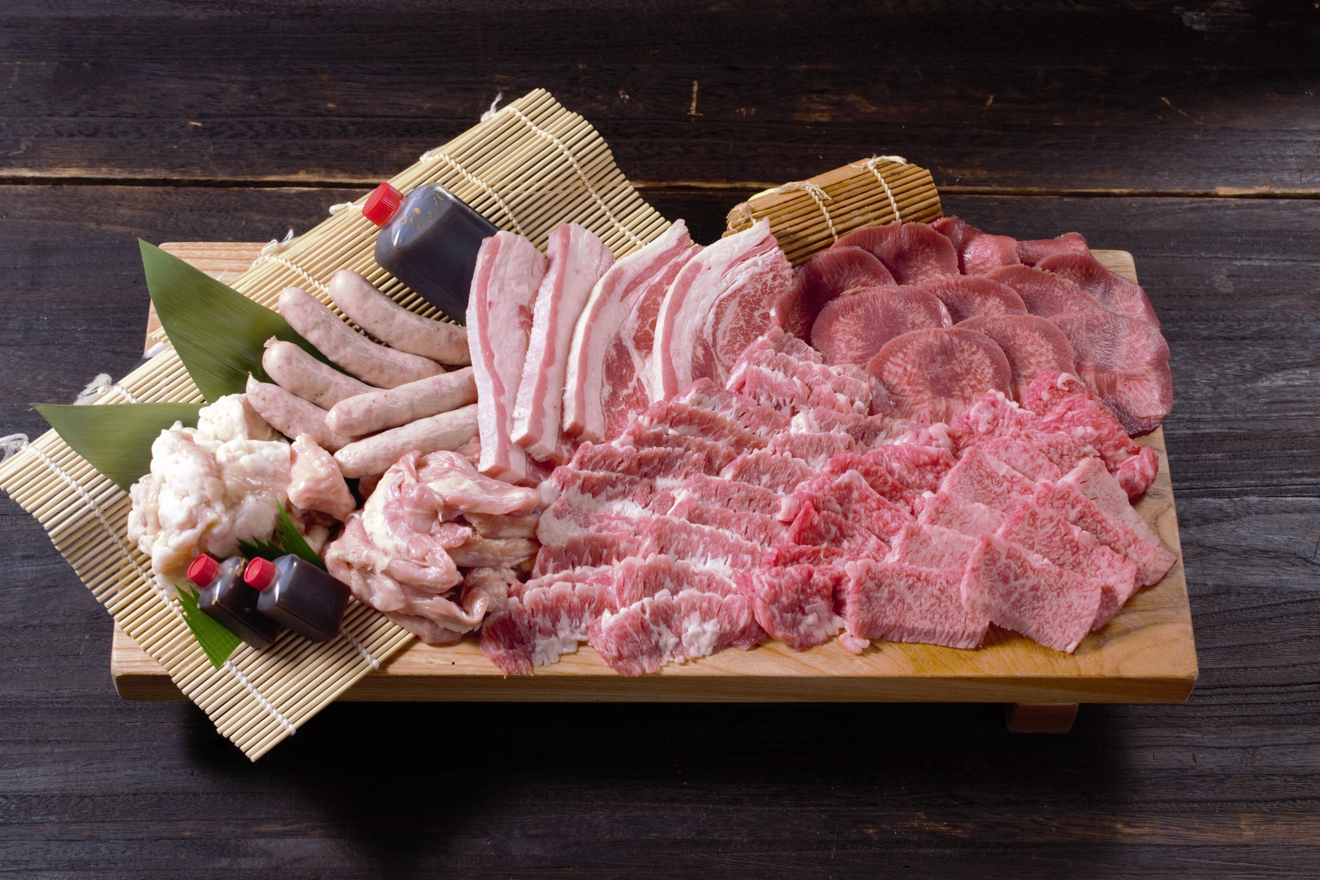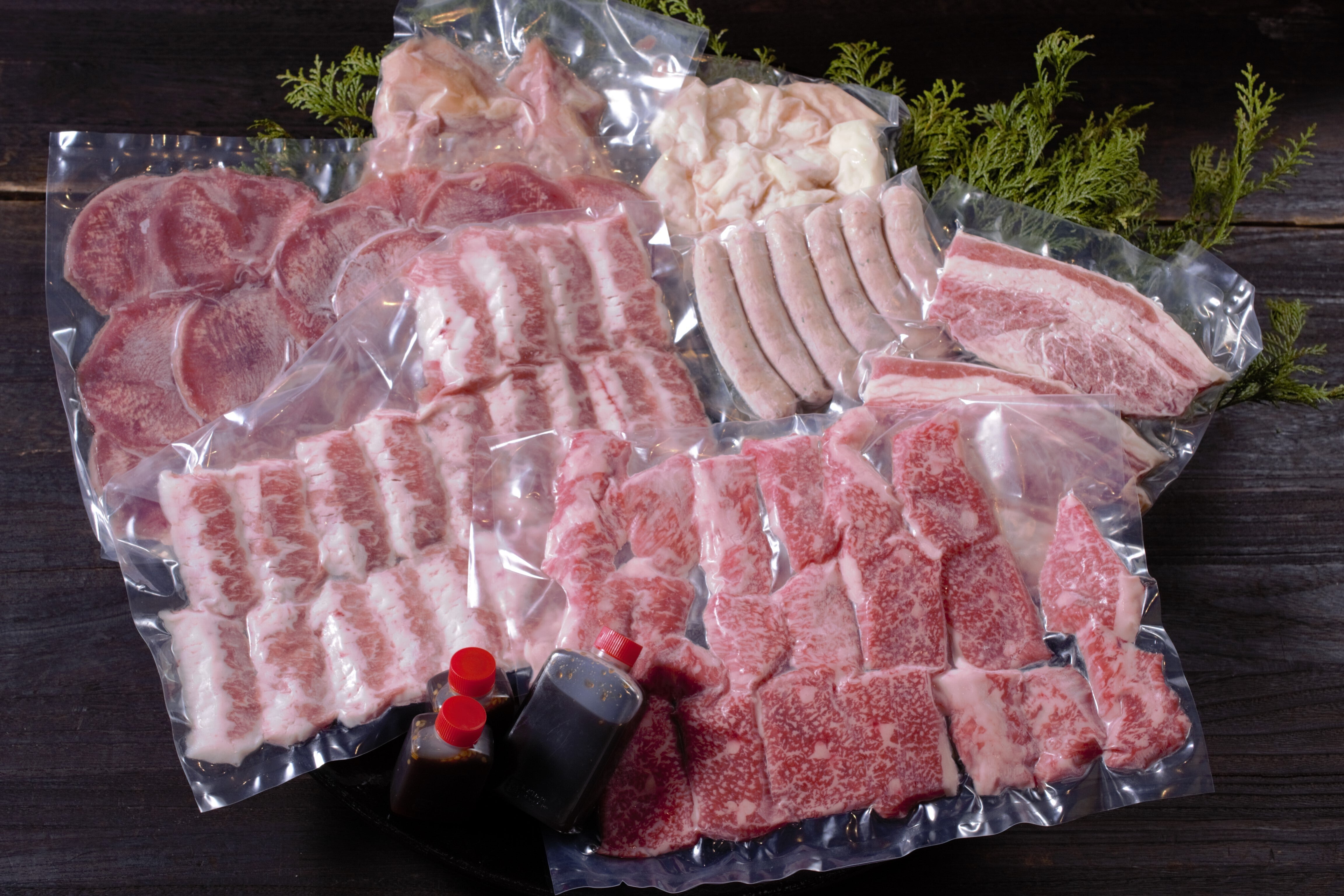 黒毛和牛カルビ:200g、黒毛和牛切り落とし:200g、厚切りカルビ:150g、タン先:200g、牛ホルモン:150g、鶏せせり:150g、特製ウインナー150g