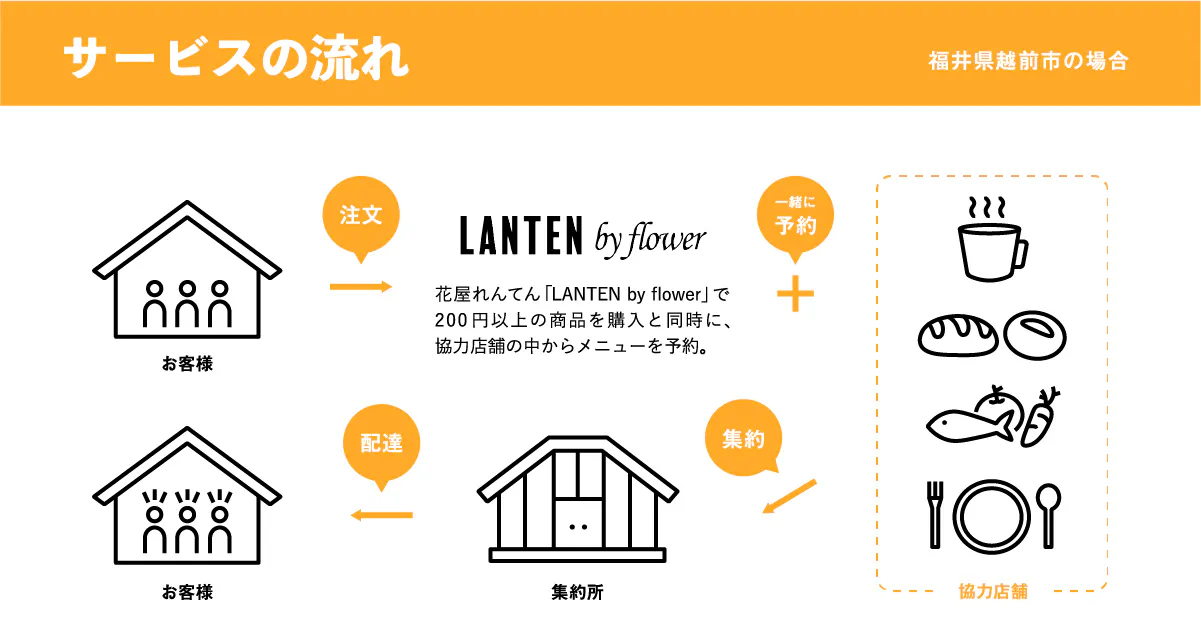 「お届けサービス」ができるリーダー店舗(例えば私たち花屋など)が、近隣の飲食店・食料品店と提携し、