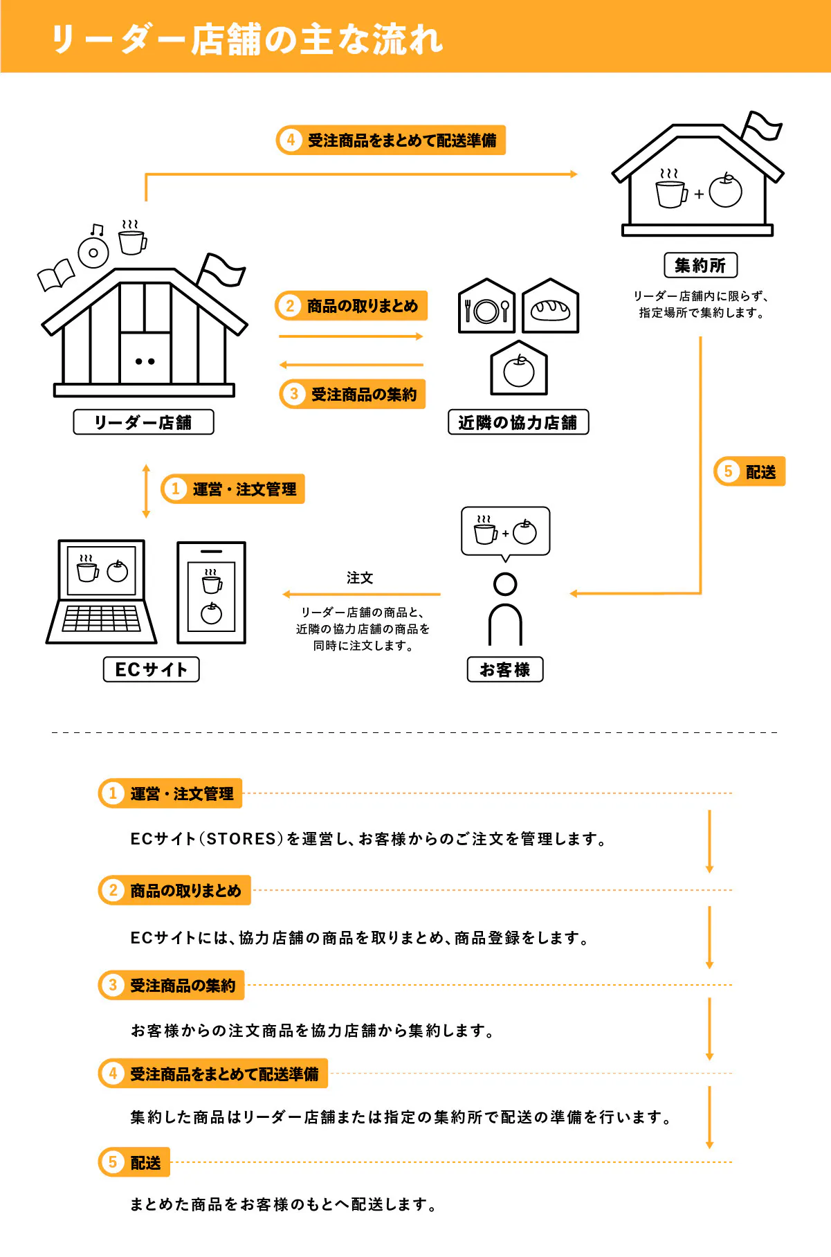 ご自宅へのお届けを担うリーダー店舗と、近隣飲食店・小売店をどんどん繋ぐことで、