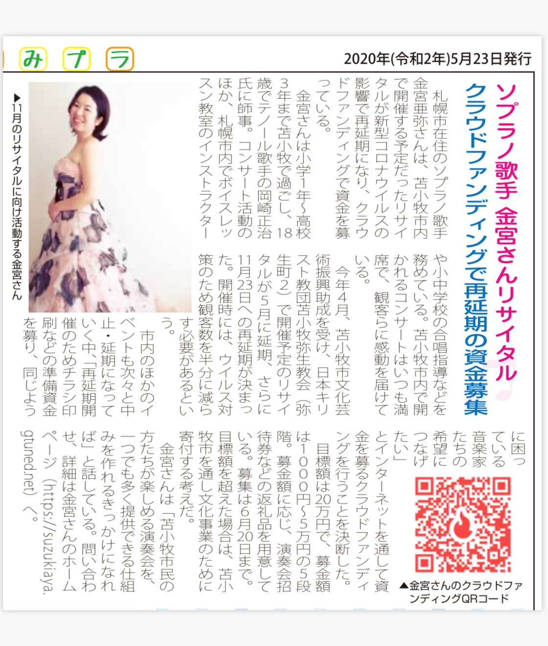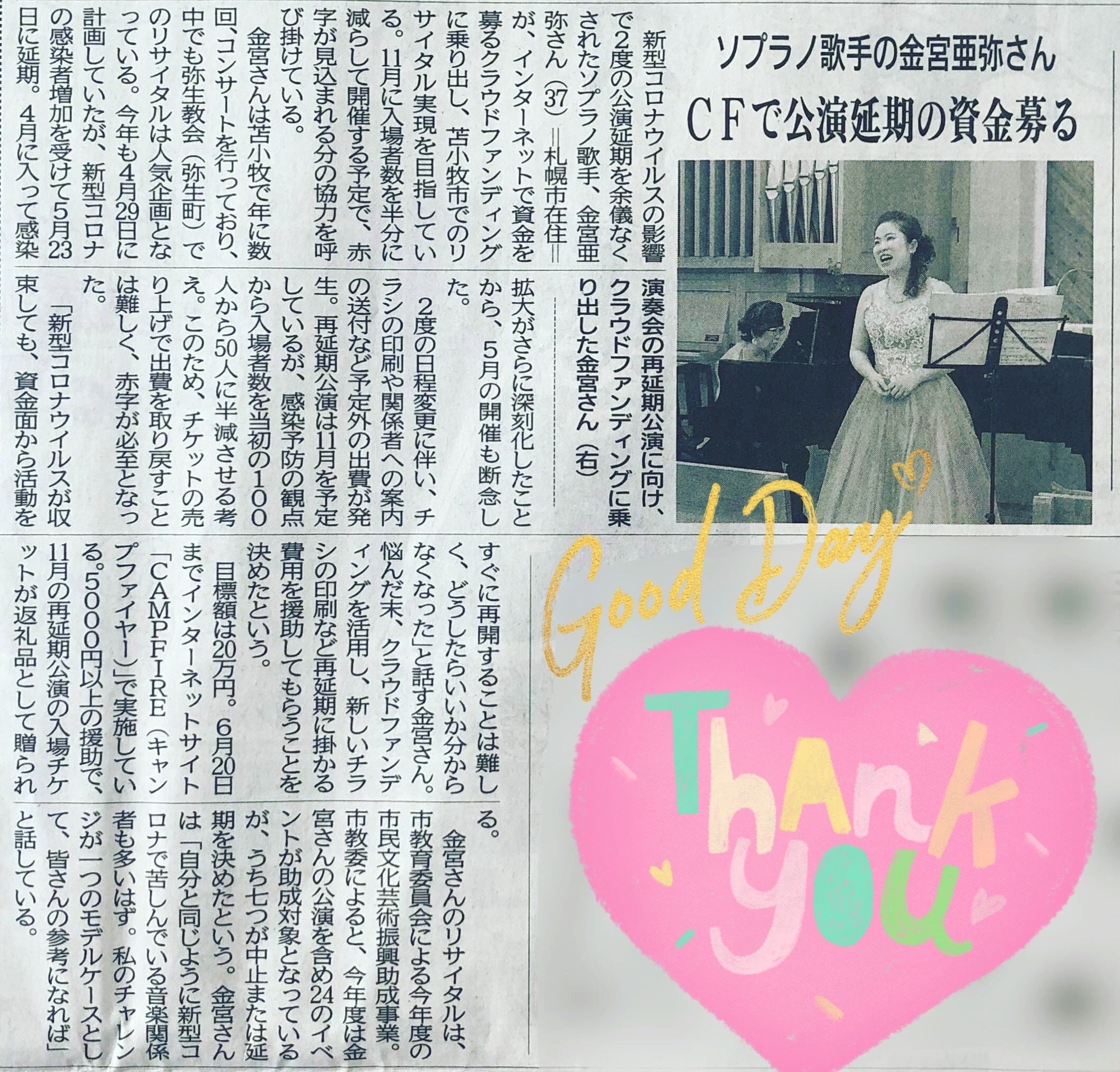 こんにちは!金宮亜弥です!先日23日発行、読売新聞の小冊子「よみうりプラザ」にて当プロジェクトが記事になりました。お隣にはいつもお世話になっている苫小牧市内の喫茶店の記事が。実は他紙やケーブルテレビの取材を受けるために苫小牧市に行った際、最後にお店に寄ったらちょうど取材されるとのことで過去にも演奏会を記事にしてくださったご縁もあり、このプロジェクトも記事になりました!タイミングとご縁に感謝してます!!新聞に掲載されたことによって少しずつ反響があり、このプロジェクトの情報拡散のお申し出や、今までにはご縁のなかった方々からのお声を頂くことが増えました。即、ご支援につながるというわけではありませんが、人と人のつながりを感じられて、人に会えない時間を過ごすわたしの慰めでもあります。ご連絡いただいた方、もちろんご支援いただいた方に最大の感謝を申し上げます。本当にありがとうございます。現状では人に会えないので、、、なかなか宣伝ということが厳しいものがありますが、ご支援とまではいかなくても情報拡散ももちろん大歓迎ですので、ぜひよろしくお願いいたします!あっというまに5月が終わろうとしていますね。不思議な1か月でした。プロジェクトの締切も1か月を切りました。当プロジェクトはAll-in方式を採用しておりますので、演奏会はかならず実施いたします。中・大規模のイベントが解禁されると安心して行えるのですが・・・どうなっていくのでしょう。それは正直まだまだ不安の中におります。以下、現時点での今後の予定です8月23日(日)小さな演奏会シリーズvol.6~日曜の午後にソプラノを添えて~札幌・苫小牧市で行う30人規模の喫茶店で行うコンサートです。毎回満員御礼!椅子を地域の体育館から借りてくるほどです^^例年夏にはやらないのですが、今年は特別に。おいしいお食事・ドルチェとともにソプラノ・ピアノをお楽しみください。場所:ダンディライオン(苫小牧市日吉町)時間:14時~(ランチご利用の方12時~入店OK予定)入場料1000円+1オーダー9月19日(土)恵庭市内にて独唱予定(詳細未定)恵庭で歌うのは初めてで楽しみにしています。どうかどうか実現しますように!10月24日(土)愛に謳えば~オールブラームス作品による演奏会~わたしの主催公演になります。こちらも本来であれば3月に実施予定でしたが、コロナの影響で延期とさせていただいております。道内のすてきな演奏家たち6人でブラームスの「愛の歌」「新・愛の歌」全曲を演奏いたします。11月23日(月・祝)当プロジェクトの振替公演です。金宮亜弥ソプラノリサイタルシリーズvol.3・・・こちらのお知らせがみなさまの元へ届けられますように。収束を切に願います!