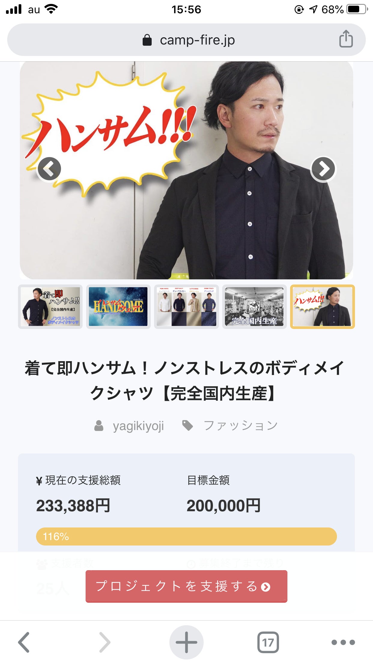 2020/05/14 20:44モノゴトの八木です。「ハンサムシャツ」へのご支援、誠に有難うございます。本日100%達成!心より感謝致します!終了までの18日間、引き続き宜しくお願いします。ご支援頂きました皆様、お届けまで少しお時間を頂きますが、お気に入りの一枚になりますことを願って、丁寧に縫製致します。楽々でありながらスタイリッシュな新感覚シャツを、どうぞご期待下さい。 もっと見る