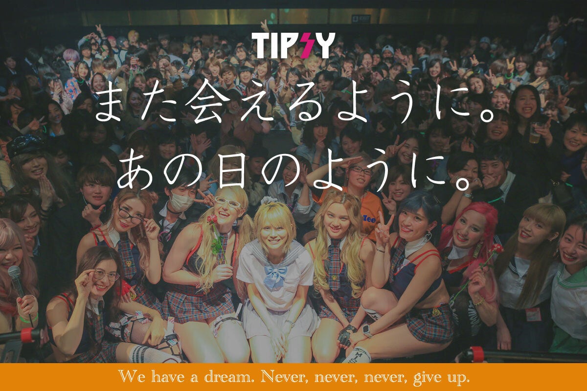 TIPSY(ティプシー)は、2012年から始まり瞬く間にクチコミで広がり続けているレズビアンやバイセクシャル女性を主軸とした日本最大の女性限定イベントです。 Lカルチャーをアンダーグラウンドから脱却させるべく、渋谷clubasia、六本木V2TOKYO、麻布十番ELETOKYO、銀座PLUSTOKYO、大阪JOULE、福岡bijouなど全国のトップクラブで成功を収め続け、すべての女性が心から解放され楽しめるパーティーを創造しています。2019年には日本最大のフェス型クラブageHaでのイベント開催を目前に大型台風直撃で延期を余儀なくされ、2020年3月には新型コロナウィルスにより再度延期を決断することとなるなど、抗うことのできない地球規模の災害により未だかつてないピンチに陥っている。