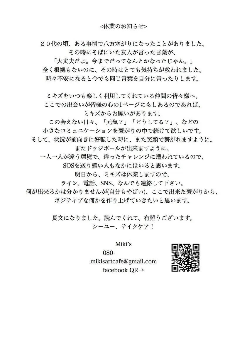 これは、休業の際にお客様へとお送りしたメッセージです。