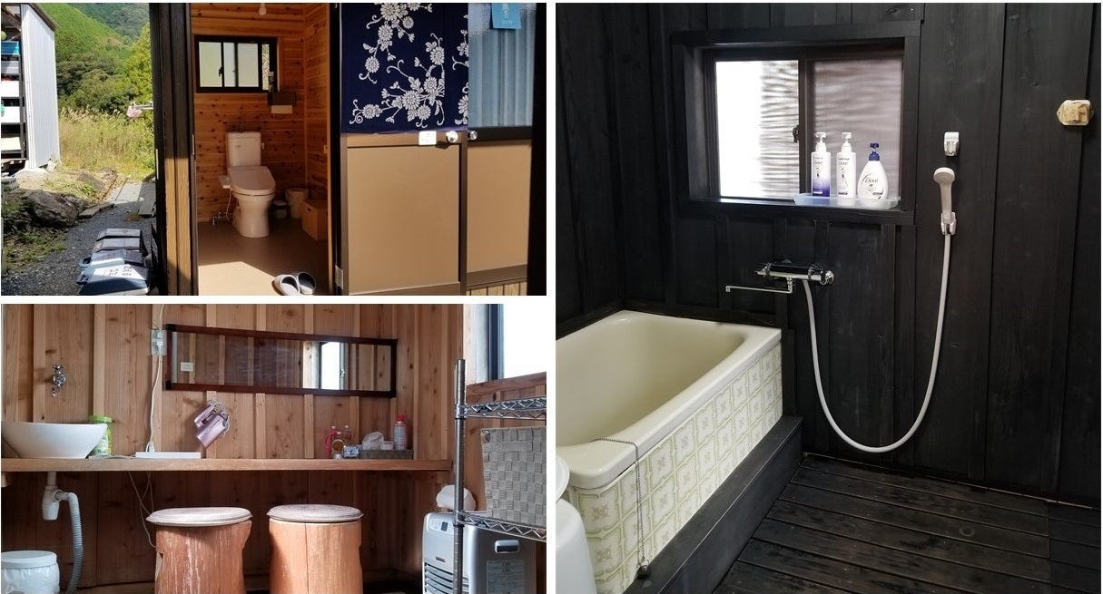築80年の民家を宿にしたため、トイレと浴室は母屋の外になります。トイレ・脱衣所・浴室