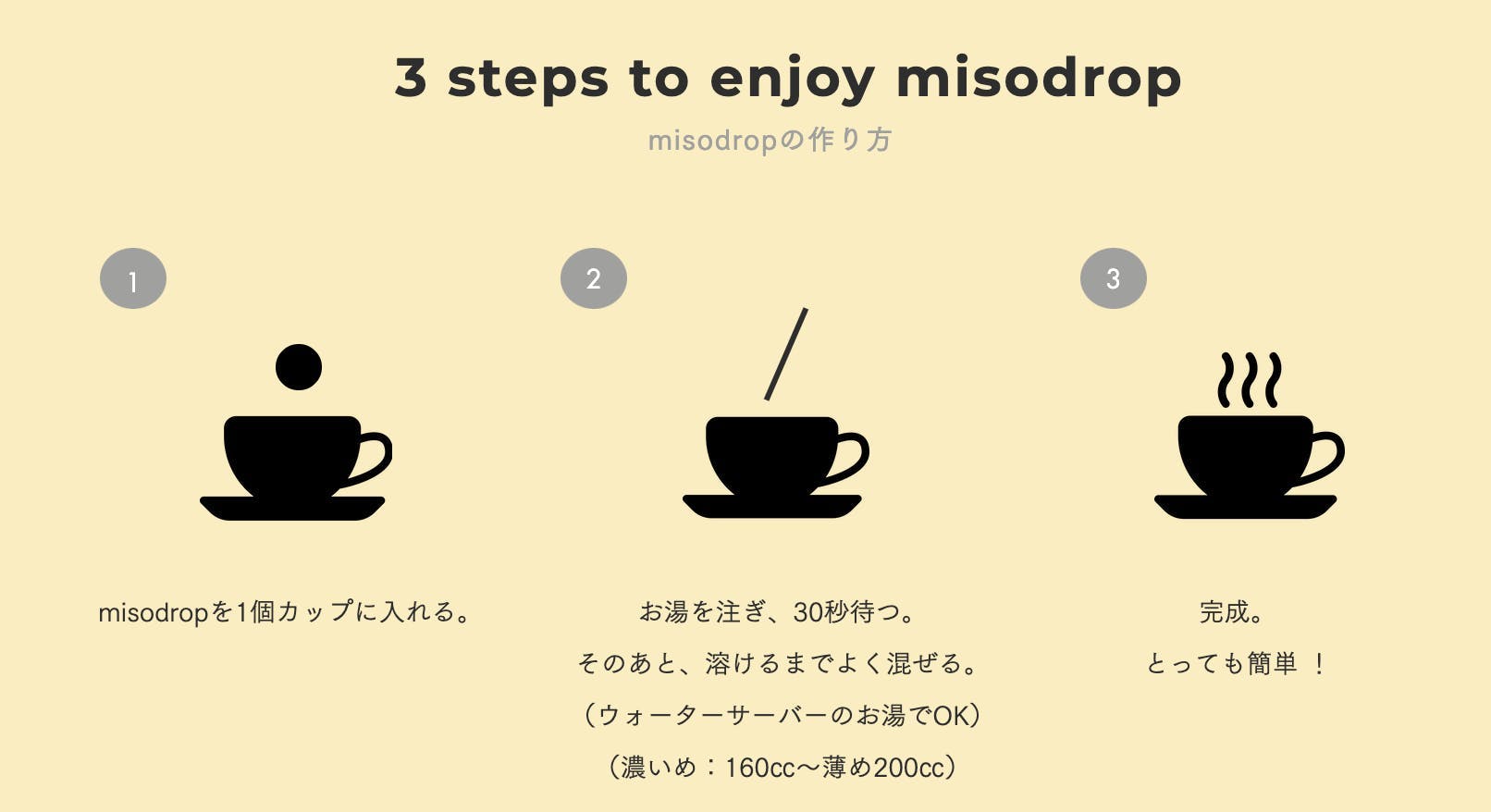 忙しくて「朝、味噌汁を作る余裕なんかない」という方々に向けて、簡単に作れる本格的かつ美味しい味噌汁はないものか、と思案を重ねました。その結果がmisodropです。片手でポンとマグカップにmisodropを入れ、お湯を注いでしばらく待って、あとはよく混ぜるだけ。お好みで乾燥野菜やチーズ、バターなどを入れて、朝のコーヒー代わりに1杯の味噌汁を楽しんでいただけます。