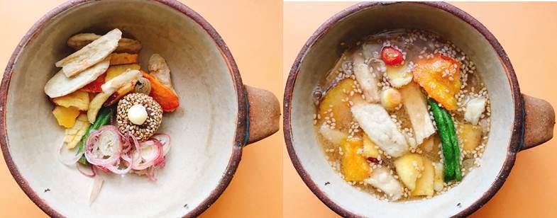 市販の野菜チップスをカップに適量入れ、misodropを1個。そこにお湯を注いで30秒待ちます。あとは味噌が溶けるまでよくかき混ぜるだけ。野菜は何でもOK! ごぼうやにんじん、玉ねぎ、じゃがいもなどがチップになったものを入れちゃいましょう。植物性のオイルを使っているものがほとんどです。チップスのオイルがコクを生み出し、野菜はしんなりしてとてもうま味の増したmiso soupになりますよ!