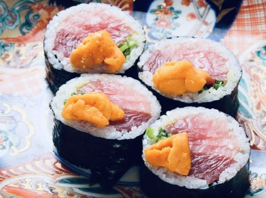 ※お店の名物三彩巻き(赤身、大トロ、生ウニ)です。