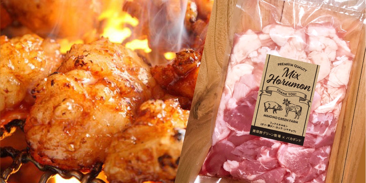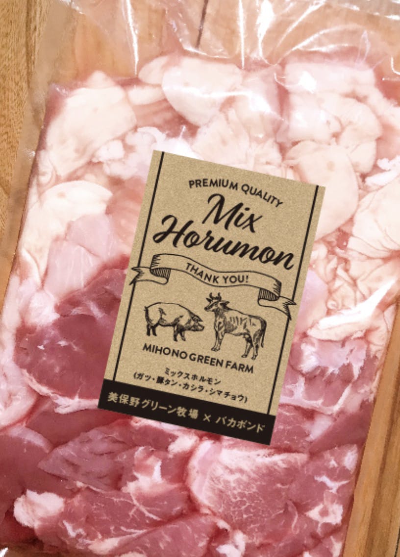 美保野グリーン牧場さんのガツ・カシラ・豚タン・シマチョウを食べやすい大きさにカットした各部位をミックスし、バカボンドオリジナルのタレを混ぜ合わせ真空した商品をリターンとします。