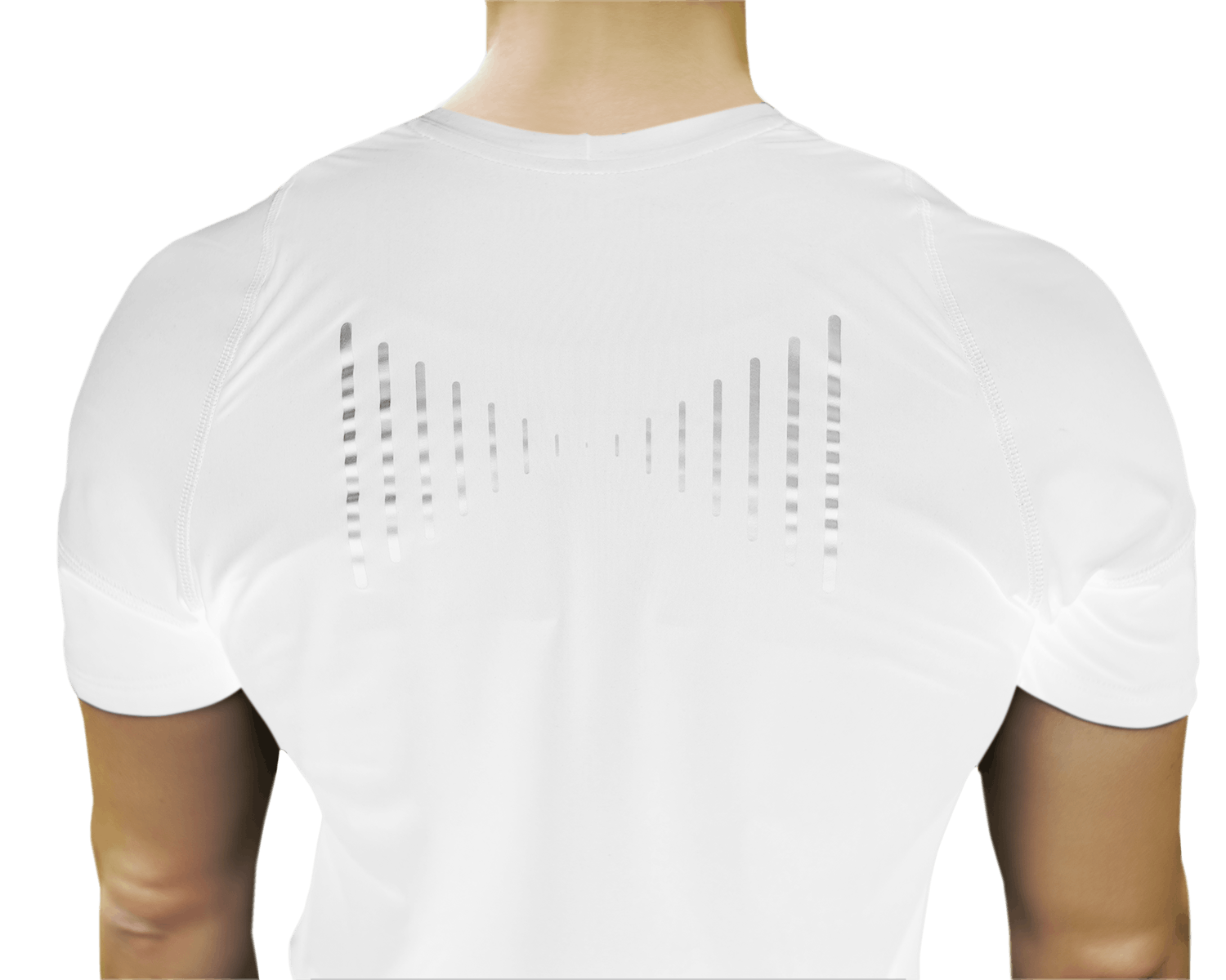 上の写真はインナーを裏返したものです。インナーの裏側、背中の内側の見えない所に特殊な形状の素材が縫い付けてあります。形状、大きさ、角度が絶妙に計算されており、これにより「姿勢反射」が起こり姿勢が自然によくなります。