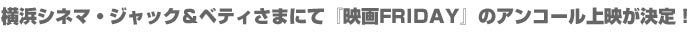 2020年2月に劇場公開された映画『FRIDAY』は横浜と音楽を愛するお客さまに多くご観覧いただき上映再延長が続きロングラン上映となりました。この作品が横浜シネマ・ジャック&ベティさまにてアンコール上映されます(緊急事態宣言解除後、 上映時期は未定です)。