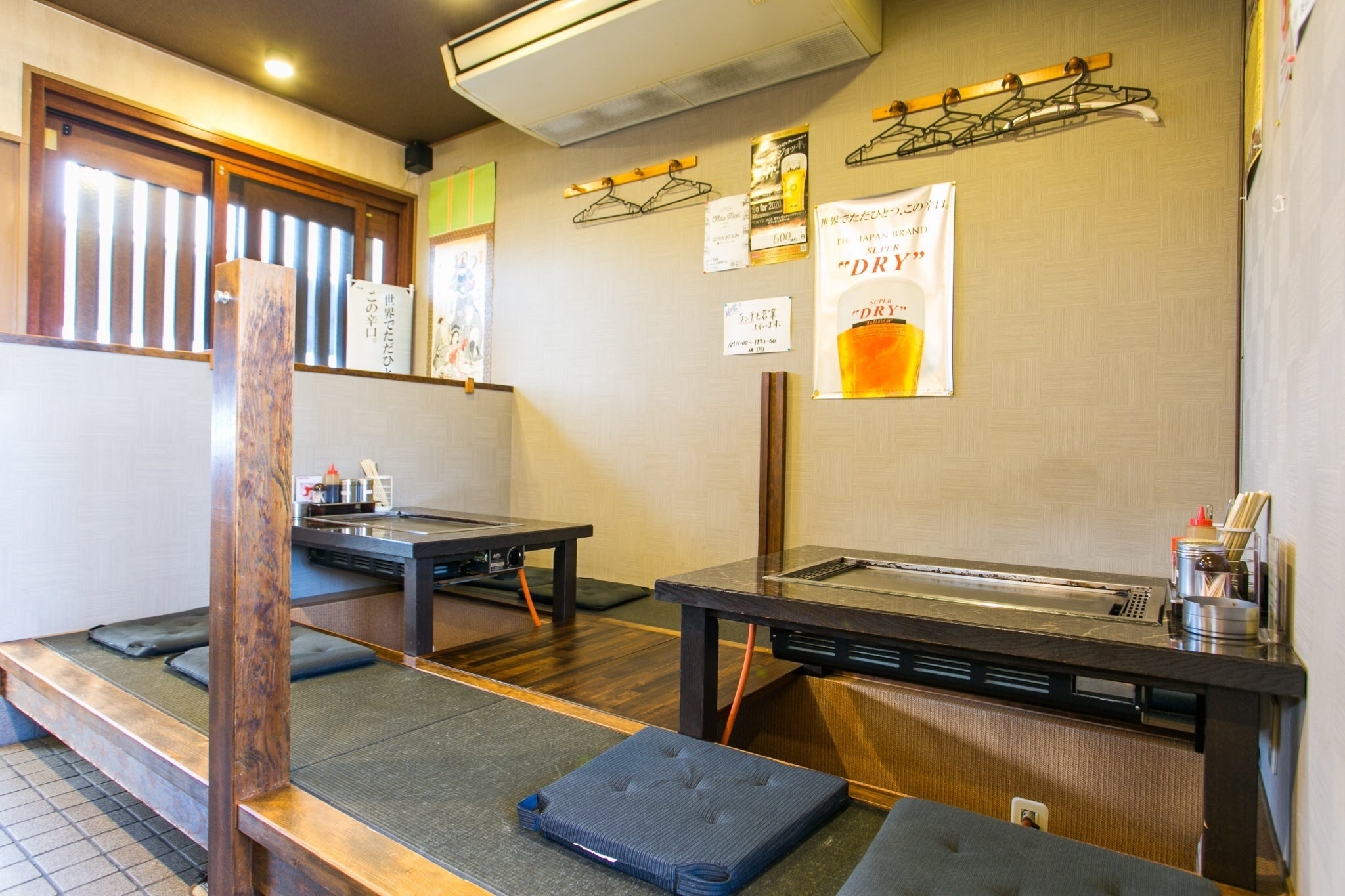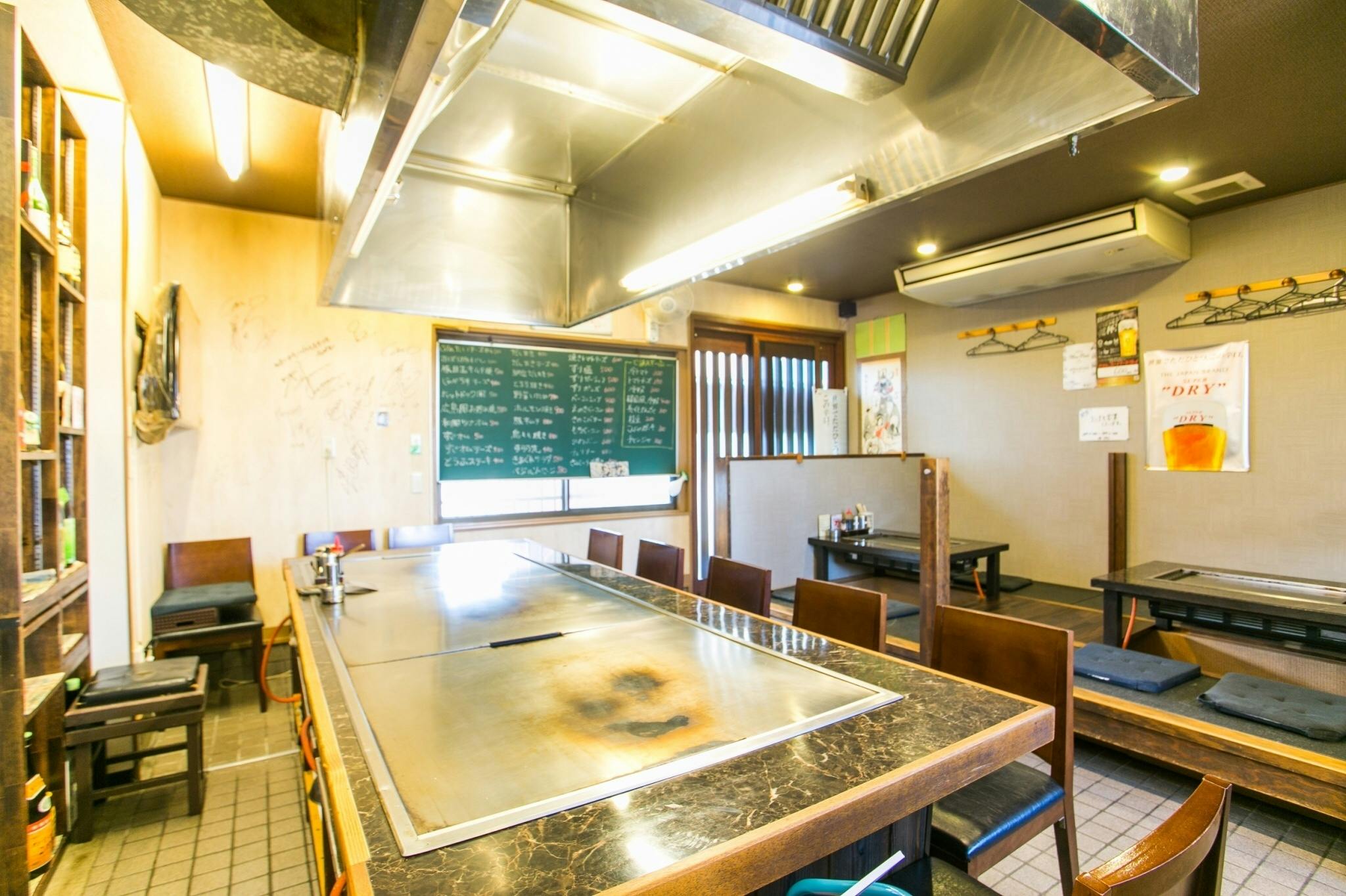 昔ながらの大きな鉄板でやく料理をお客様が囲んで和気あいあいと下町感溢れる店内になっています。