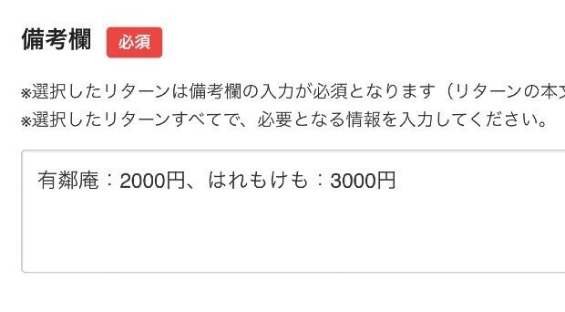 ⑤必要情報入力欄の下にある「備考欄」に「支援店舗の名前」と「金額」を書く。