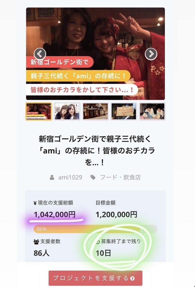 2020/05/31 00:00本日23:59にてプロジェクト終了となります。現在目標金額の95%を達しました!!沢山の御支援を本当にありがとうございます!緊急事態宣言が解除され、都内でも徐々に営業再開するお店が増えてきました。amiは、東京都のアラートに従い、都内の感染者が減り営業再開して良いとされる「ステップ3」に進んでから営業再開する事を決めました。昨日ami営業再開に向けて、店内に飛沫感染防止のビニールシート作成や換気のための機材設置,出入口のカーテン改良等、皆様をお迎えする準備を進めております。このプロジェクトを通じて、皆様からのお力添えが、休業中のamiにとってどんなに心強く、諦めずに前を向く力になったか計り知れません。一歩ずつamiで皆様に会える日に近づいていると思うと、感無量です。本当に、有難うございます。ここまで支えてくださった方、温かいお言葉をかけてくださった方、ご支援くださった方皆様に感謝申し上げます。本プロジェクトは5月31日23:59まで。残り24時間。無事amiの営業再開日が決まり次第、支援者の皆様方へ「営業再開」に関するご連絡をメールにてさせていただきます。改めまして、皆様のご支援に対して心より御礼申し上げます。最後になりますが、目標達成まで本当にあと少し。本プロジェクトをより多くのゴールデン街を愛する人へ、amiで共に楽しい時間を過ごした方へ届くように、ぜひ皆様のSNS等でご紹介・拡散して頂ければ幸いです。その際に以下のテキストやハッシュタグを活用していただき、ご紹介・拡散お願いいたします。***********『新宿ゴールデン街で親子三代続く「ami」の存続に!皆様のおチカラを…!』https://camp-fire.jp/projects/view/261650#CAMPFIRE#ゴールデン街#親子三代#大学生の挑戦#好きなお店が消える前に#楽しいamiを取り戻そうご協力お願い致します!!では、amiが営業再開する日まで… 皆様にお会い出来る日を楽しみにしております。 もっと見る【目標金額まで15万8,000円!】ついに100万円に達しました!!残り10日でプロジェクト終了!