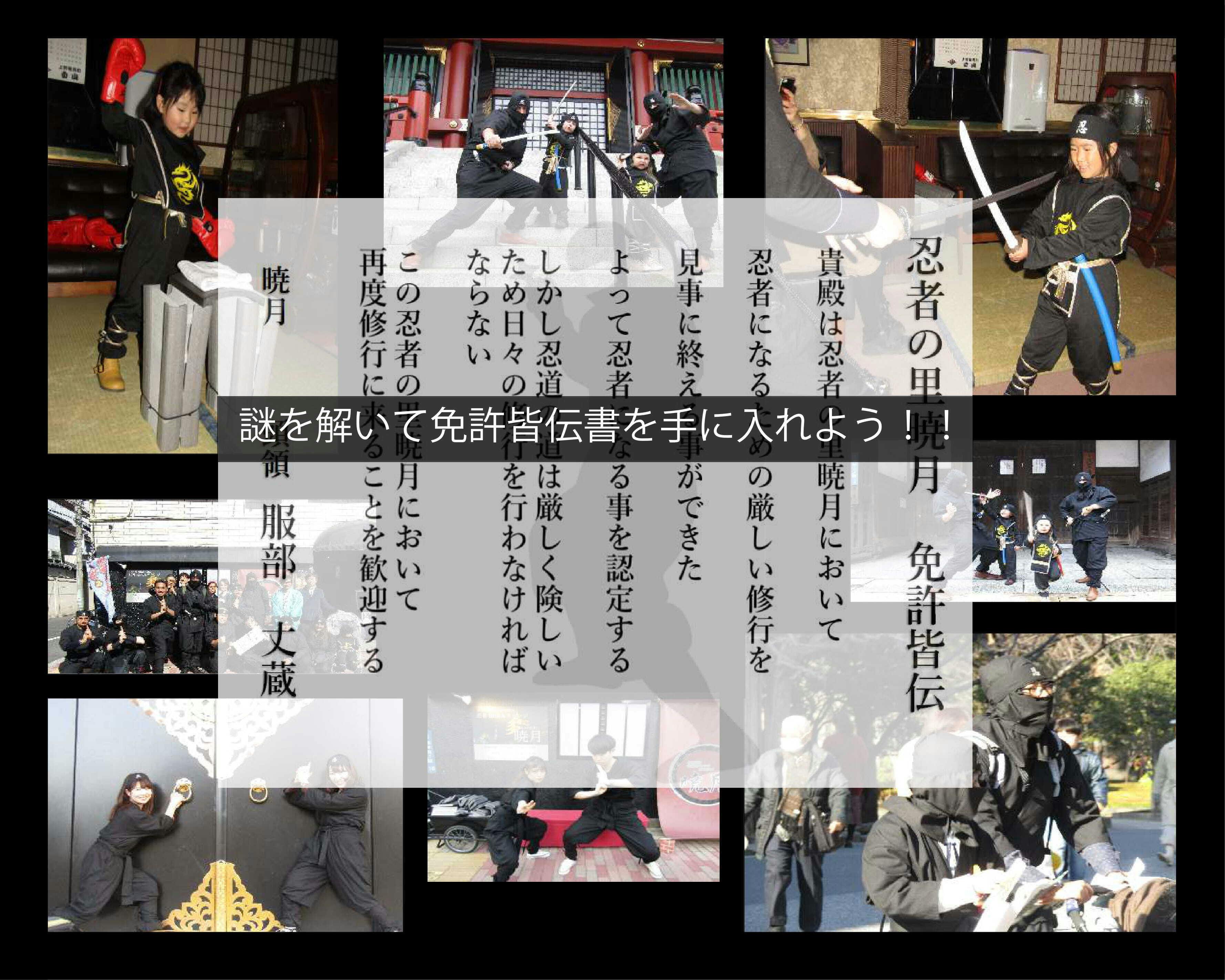 忍者体験の内容:【着替えと九字切り】→【殺陣】→【紐や苦無】→【手裏剣や棒手裏剣投げ】→【影剣劇ショー】→【偵察ミッション】という流れで体験して頂いております。殺陣や武器の扱いはスタッフがお手本をお見せしながら丁寧に教えさせて頂いております。偵察ミッションは1850年の古い地図を使った謎解きゲームです。浅草には多くの観光スポットや建造物がございます。そこへ忍者の格好をし親子や仲間と協力しながら全10問の問題を解き免許皆伝書を見つけ持ち帰る内容となっております。