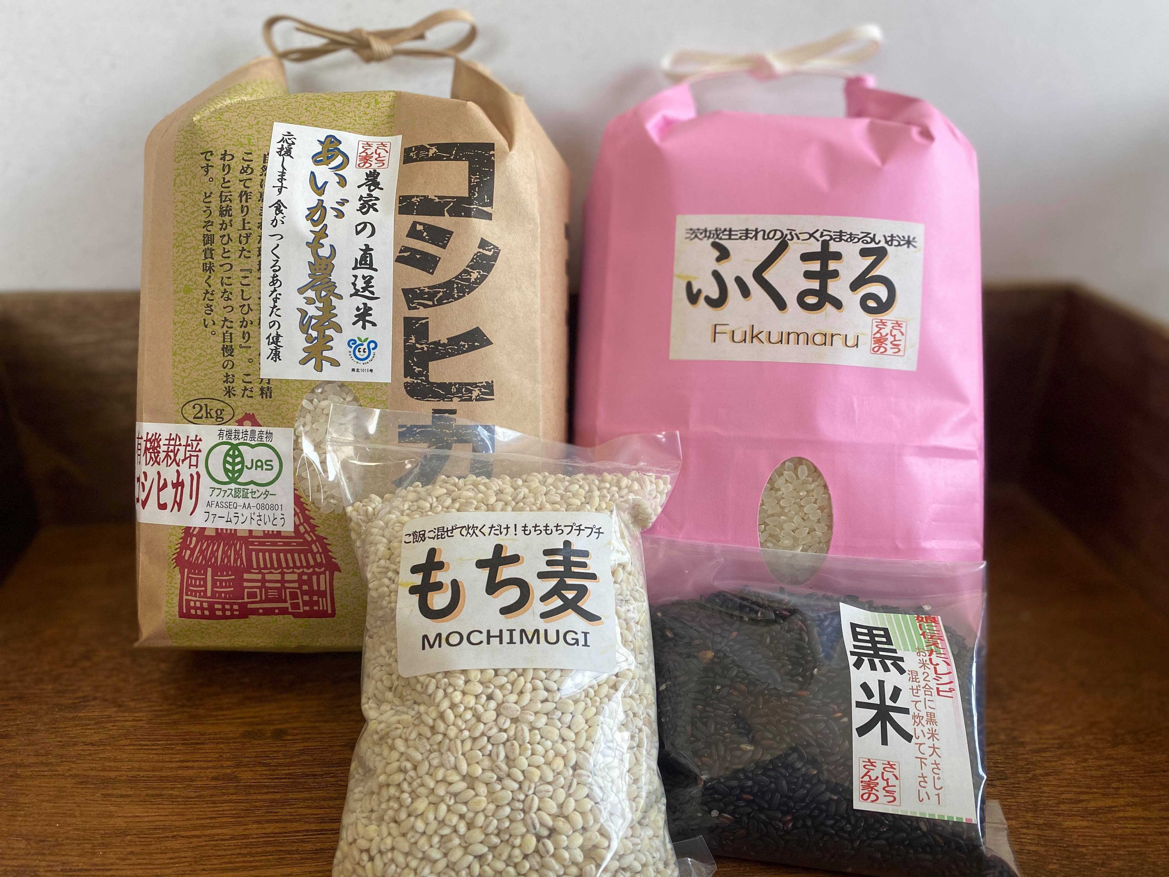 出品: ①〈お米二種の食べ比べと黒米、もち麦のセット〉+季節のおまけ