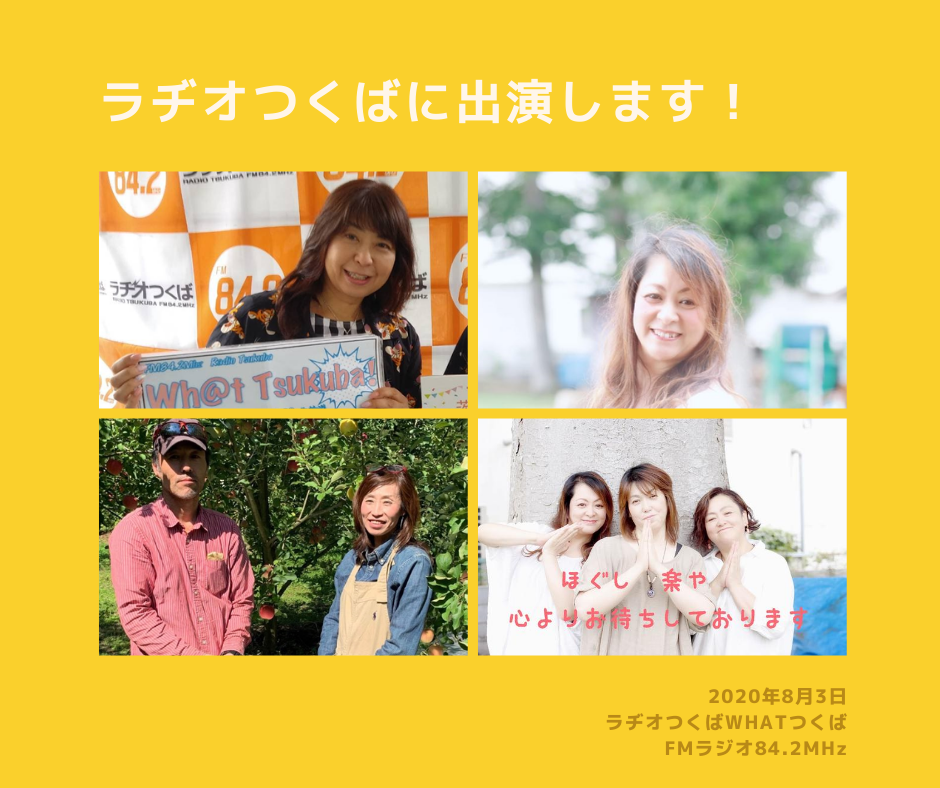 【本日 8/3(月) 茨城まごころオンラインマルシェ 出店者3名が、ラヂオつくばに出演します!】本日11時から~ラヂオつくば~聴いてね~♪▼ネクストゴールへチャレンジ中!▼https://camp-fire.jp/projects/view/261762/プロジェクトは残り4日となりました~!ご支援を頂き本当にありがとうございます!深く感謝申し上げます。8月3日(月)ラヂオつくば「What Tsukuba!」FMラジオ84.2MHz●ゲスト●11時30分から おててのて 安真理さんわっはっは体操でストレス発散♬元気100倍!11時45分から 楽や 安真理さん、田口晴美さん12時30分から 藤田観光りんご園 藤田史子さん大子のりんご美味しいよ~♪アップルパイとってもおすすめ!●パーソナリティー●あっちゃんこと赤羽 敦子さん♪ぜひ、お聴きくださいね~♪私、吉村千鶴子もスタジオへ応援に行きます~♪。oOo。.:*:.。oOo。.:*:.。oOo。.:*:.。oOo。【ラヂオつくばを聴くには】ラヂオつくばはFMラジオ84.2MHzです。エリア外の方は以下の方法でもお聴きいただけます。☆スマホからは、『TuneIn Radio』アプリをダウンロード。地域→アジア→日本→関東→茨城→ラヂオつくばで試聴いただけます。☆PCからは「サイマルラジオ」 simul radio で、検索。ラジオつくば→放送を聴く詳細は「ネットでラヂオつくば!」http://radio-tsukuba.net/simul/のページでもご案内しております。。oOo。.:*:.。oOo。.:*:.。oOo。.:*:.。oOo。引き続き、茨城県の中小企業の皆さんの応援!を宜しくお願い致します!