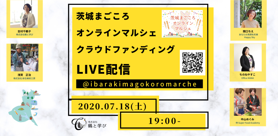 おはようございます!「茨城まごころオンラインマルシェ」吉村千鶴子です。いよいよ本日が、クラウドファンディングの最終日となります。ご支援、応援を頂き誠にありがとうございます!【茨城まごころオンラインマルシェ LIVE配信】▼視聴はご覧の茨城まごころオンラインマルシェのページより▼https://www.facebook.com/ibarakimagokoromarche/↑前回のライブ配信の様子です。Facebook LIVE配信本日夜19時から~!2020年8月7日(金)19:00~(75分の配信予定)▼視聴はご覧の茨城まごころオンラインマルシェのページより▼https://www.facebook.com/ibarakimagokoromarche/▼ゲストご紹介▼間中製麺所 間中健一郎さん・間中正美さんハーブサロンROOT おおそねみちるさんミラクルストーン 皆かわさとみさんコトバtoデザイン 徳光千春さんタケノウチツグミさんナビゲーター 吉村千鶴子でお送りいたします。ライブ配信中に「いいね!」「シェア」をしていただけるとめっちゃうれしいです♪宜しくお願い致します!