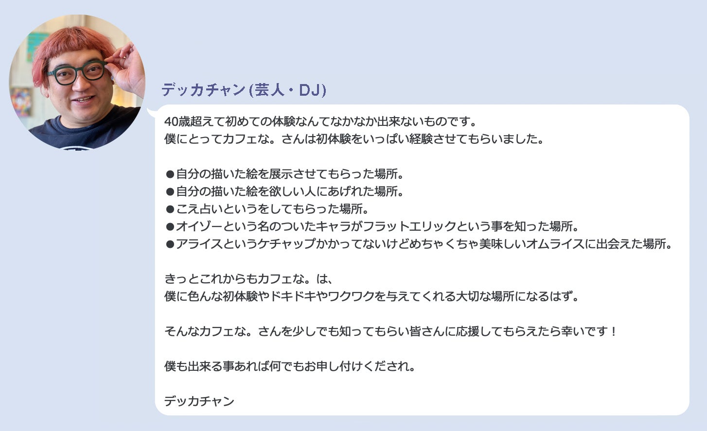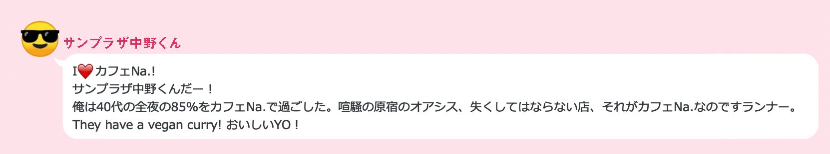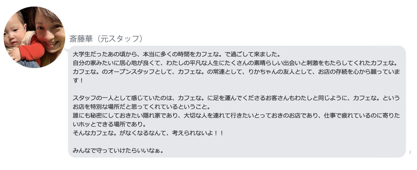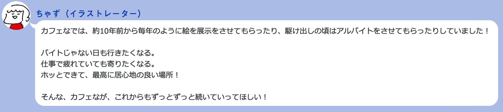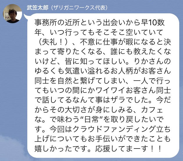 この度はCAMPFIREプロジェクト「原宿で頑張って19年!カフェな。を続けたい!」にご支援いただき誠に感謝致します。本当にありがとうございます!