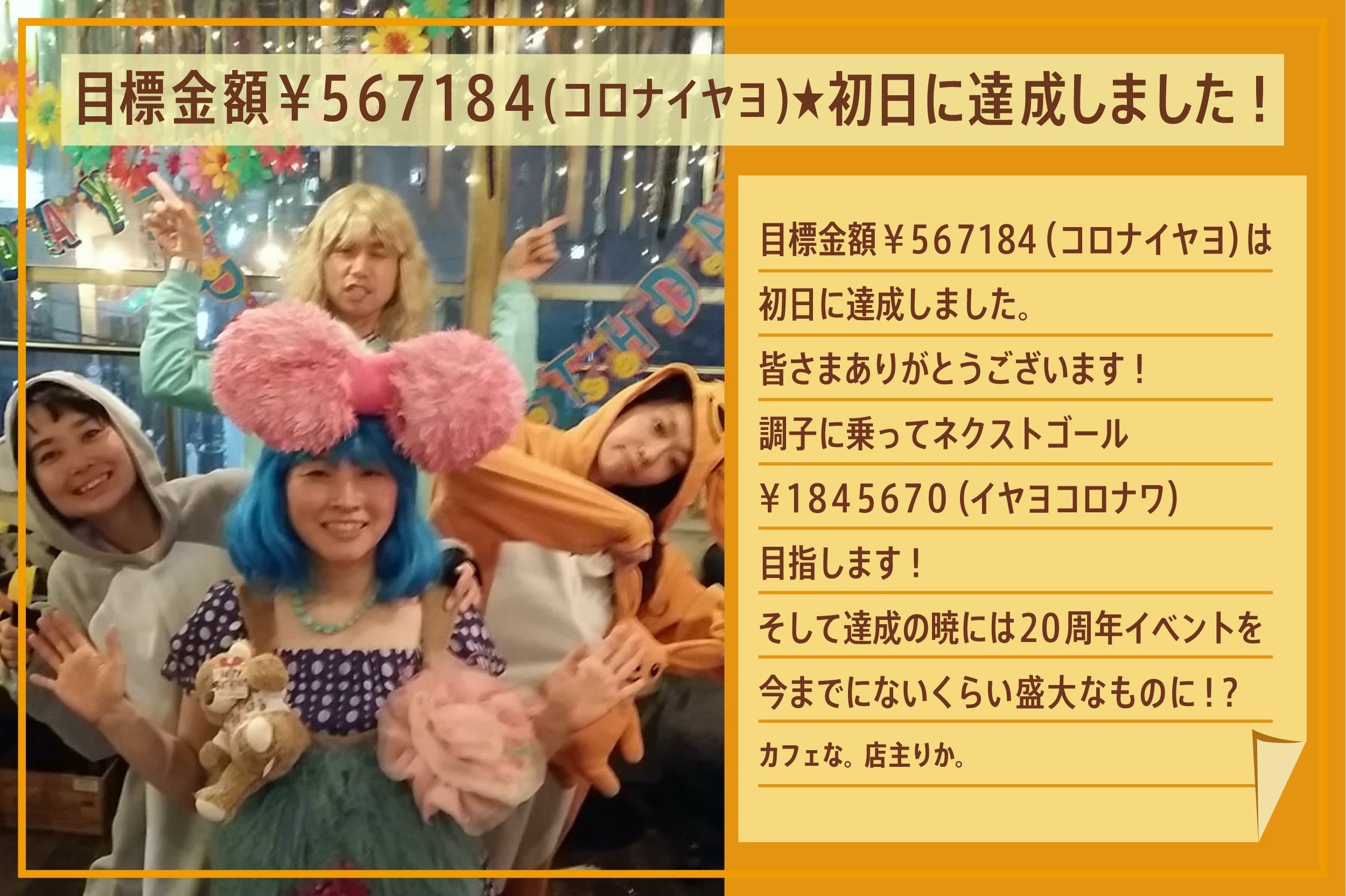 おかげで元気に時短営業中、クラウドファンディングはネクストゴール¥1,845,670(嫌よコロナは)に向かって爆進中です!