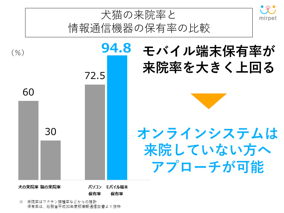 飼育頭数に対しての、動物病院への来院率が犬で約60%、約猫で30%ほど