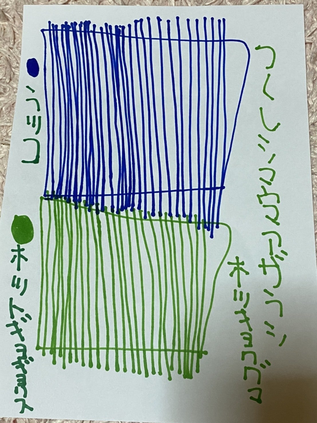 自閉症の方たちはある一定の「こだわり」を持つことが多いのですが、作品にとって「こだわり」は作風に繋がる「味」だと感じています。彼はその味を存分に発揮している作家さん。今回採用した作品のタイトルは「庄内川」Googleマップで見るとちゃんとY字になっていたり、緑地があったり(緑を重ねて色が濃くなっている部分)、かなり忠実に再現されていることがわかります。時折、「ボクはがんばっています!」と自らを鼓舞しているというエピソードが、個人的にツボです。。。