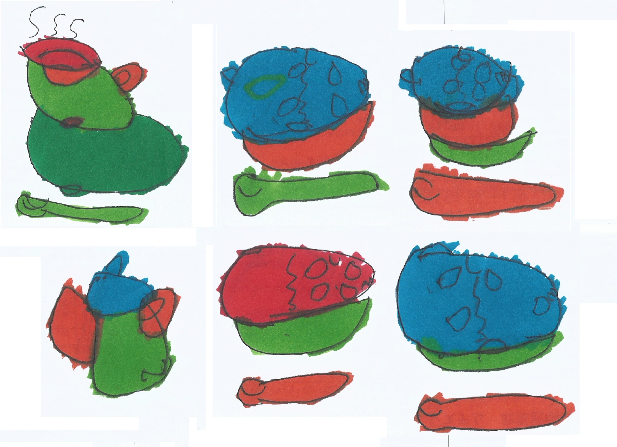 独特のタッチと色遣いで、シュールなコーヒーやカレーライスを描いてくれています。このプロジェクトを機に、アートを始め、こんな作品が描けるんだ!とスタッフさんたちも驚いています。シールを貼る作品もお得意。最初はきれいに並べる→どんどん広がる、という手法で貼っていき、最終的に「シャボン玉が広がっている」ような作品も仕上がりました。言葉を持たない彼は、完成時に「\(^o^)/(できた!)」と万歳していたそうです。
