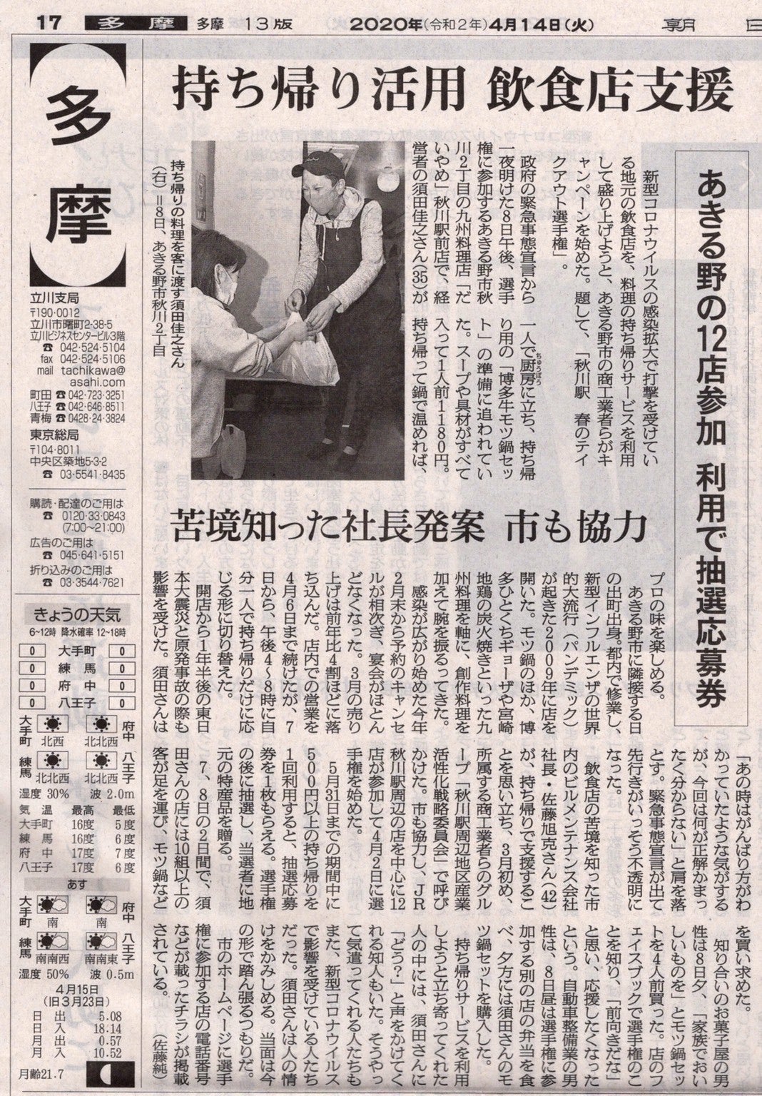2020/05/19 18:00温かいご支援と応援、本当にありがとうございます!コロナウイルス感染拡大防止に伴う緊急事態宣言がでてから1か月と半分過ぎました。最初はテイクアウトを開始しました!初めての事でとまどいながらも、たくさんの常連様や仲間達に支えられて、新聞にも取り上げてもらえました。その次に通販を開始した所、友人がインスタグラムに投稿してくださり、遠くは広島からたくさんの方に応援して頂きました。そしてクラウドファンディングに参加させてもらったのは5月7日!早いもので10日以上の日が経過しています。人生はどんな事があっても時間は経過していきます。皆様も大変な中、ご支援頂き、応援コメントも書いてもらい、味わう事の出来ない感情になっていて感慨深いです。こんな事になって良くはないのですが、こうやって皆様にご支援頂き優しさを頂き、皆様との繋がりが出来た事に感謝します。継続させて、たくさんの笑顔と笑い声が聞けるように頑張っていきます!ありがとうございました! もっと見る