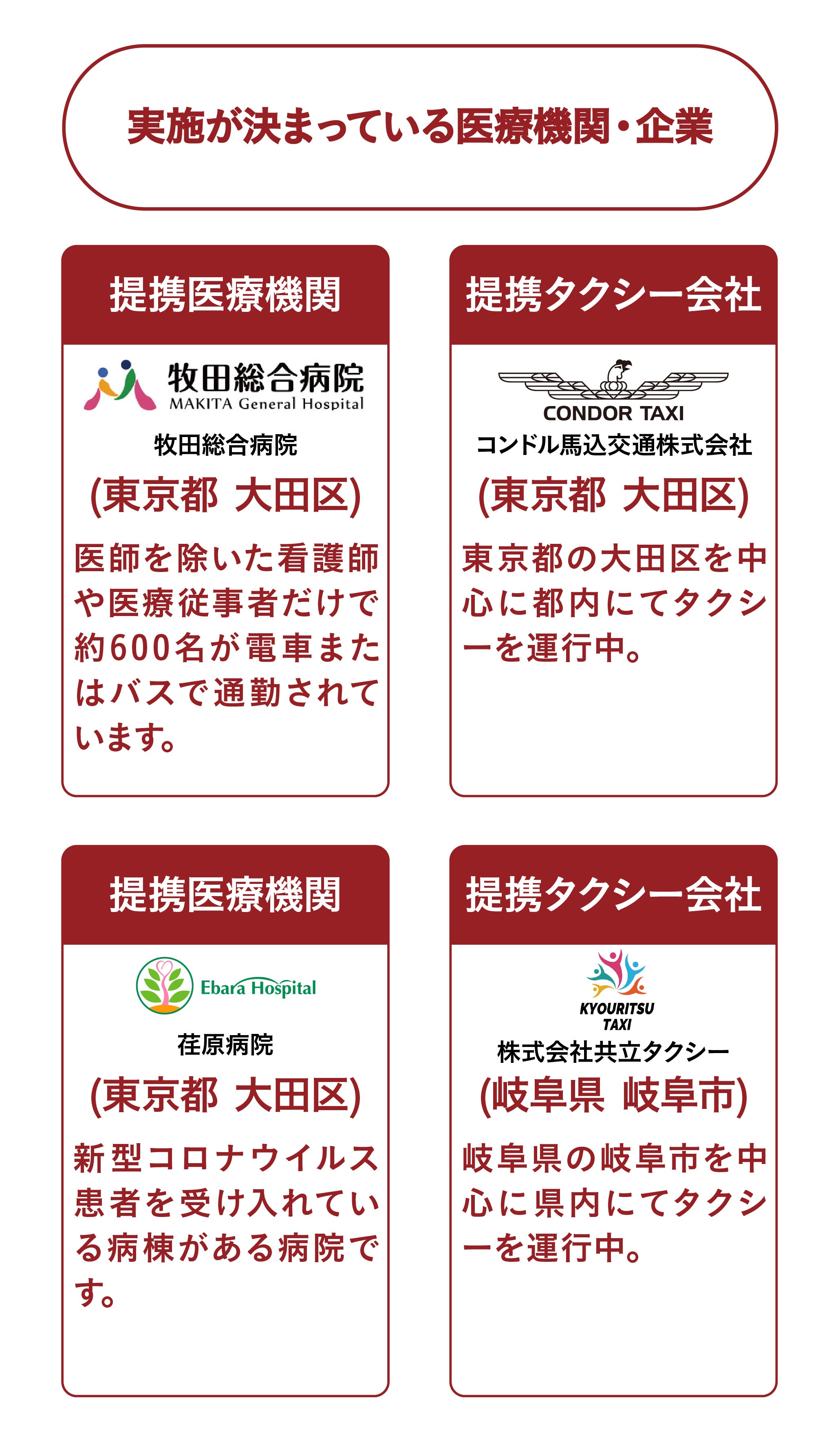 For this initial fundraiser, we have partnered with Makita General Hospital and the taxi companies Condor Magome Kotsu Co., Ltd. and Kyoritsu Taxi Co., Ltd.